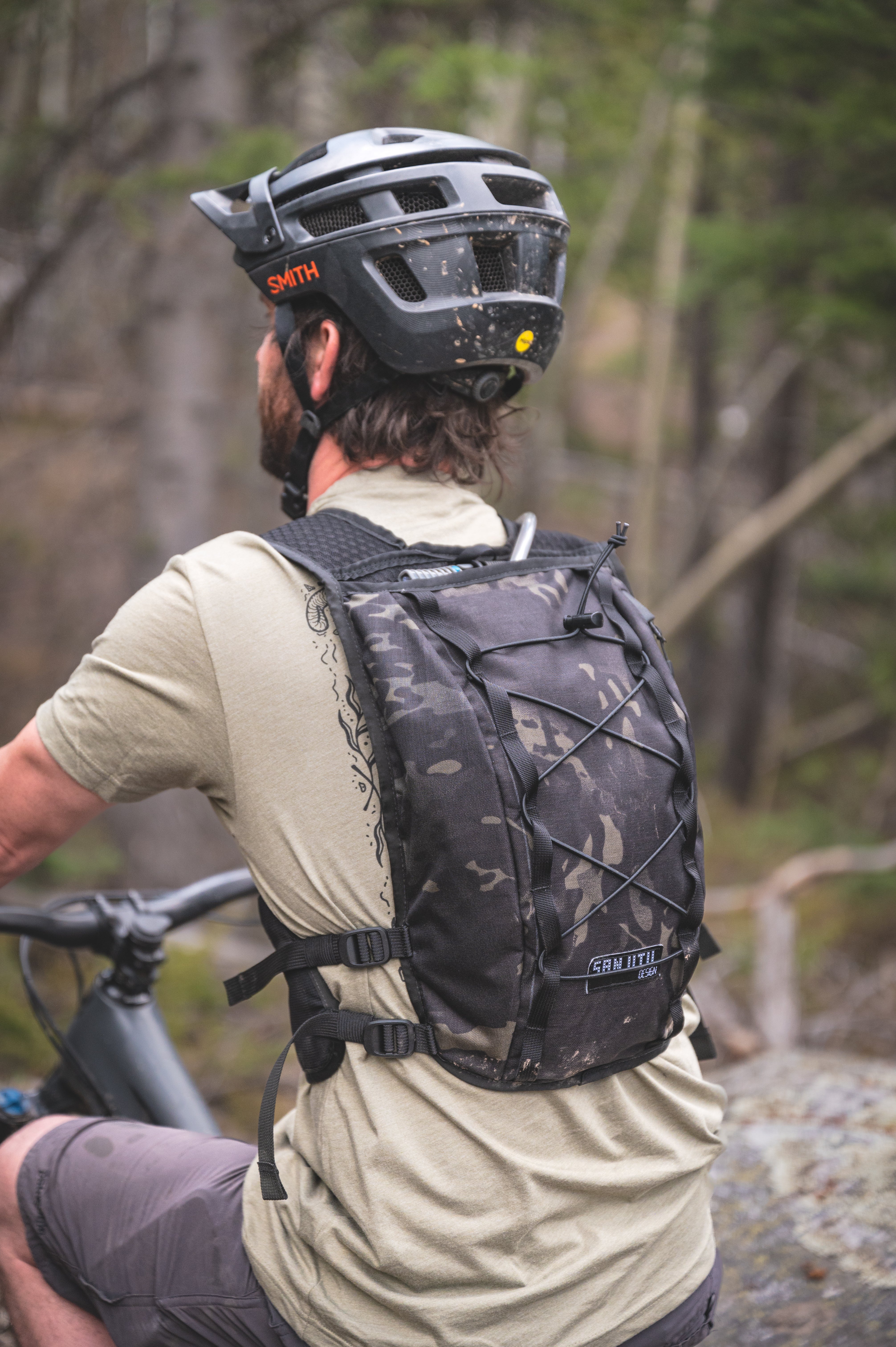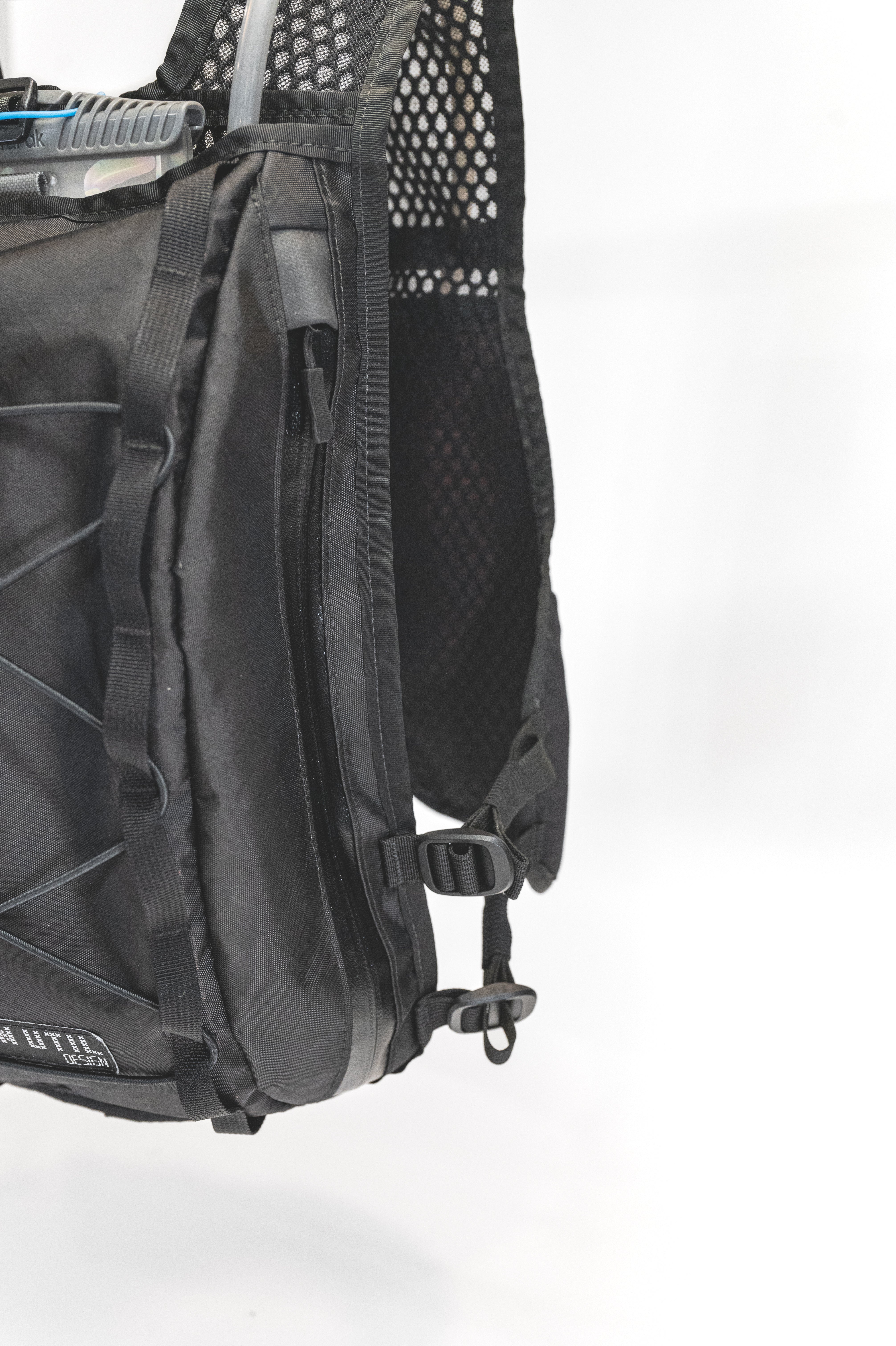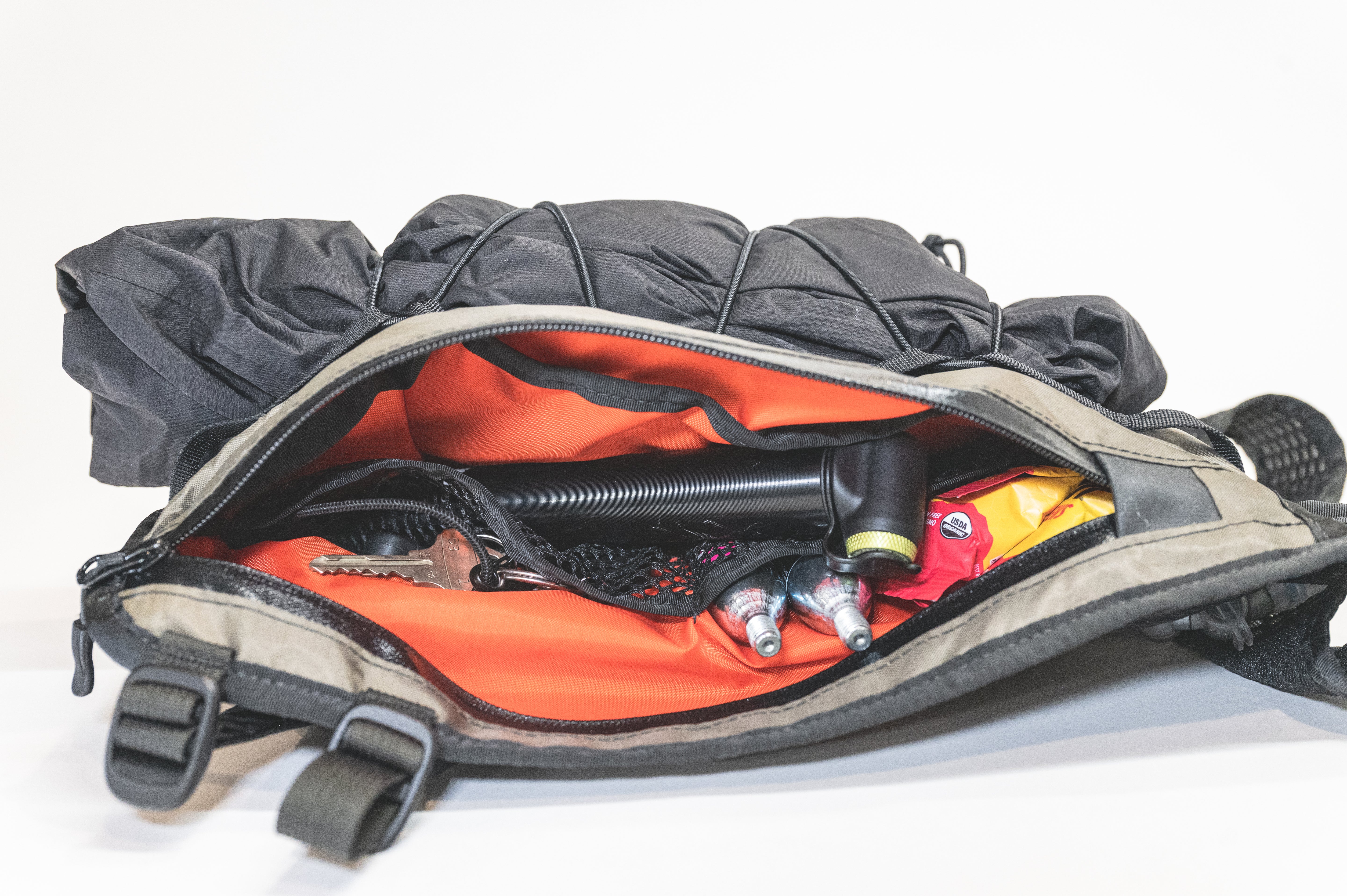 Around back, there’s a dedicated sleeve for a 2L Hydrapak bladder — and a separate main cargo zone with side access, so your zipper isn’t caked in rear-tire mud halfway through the day. Two side-access organizer pockets make gear sorting easy, and a key clip keeps your truck key out of the canyon.
