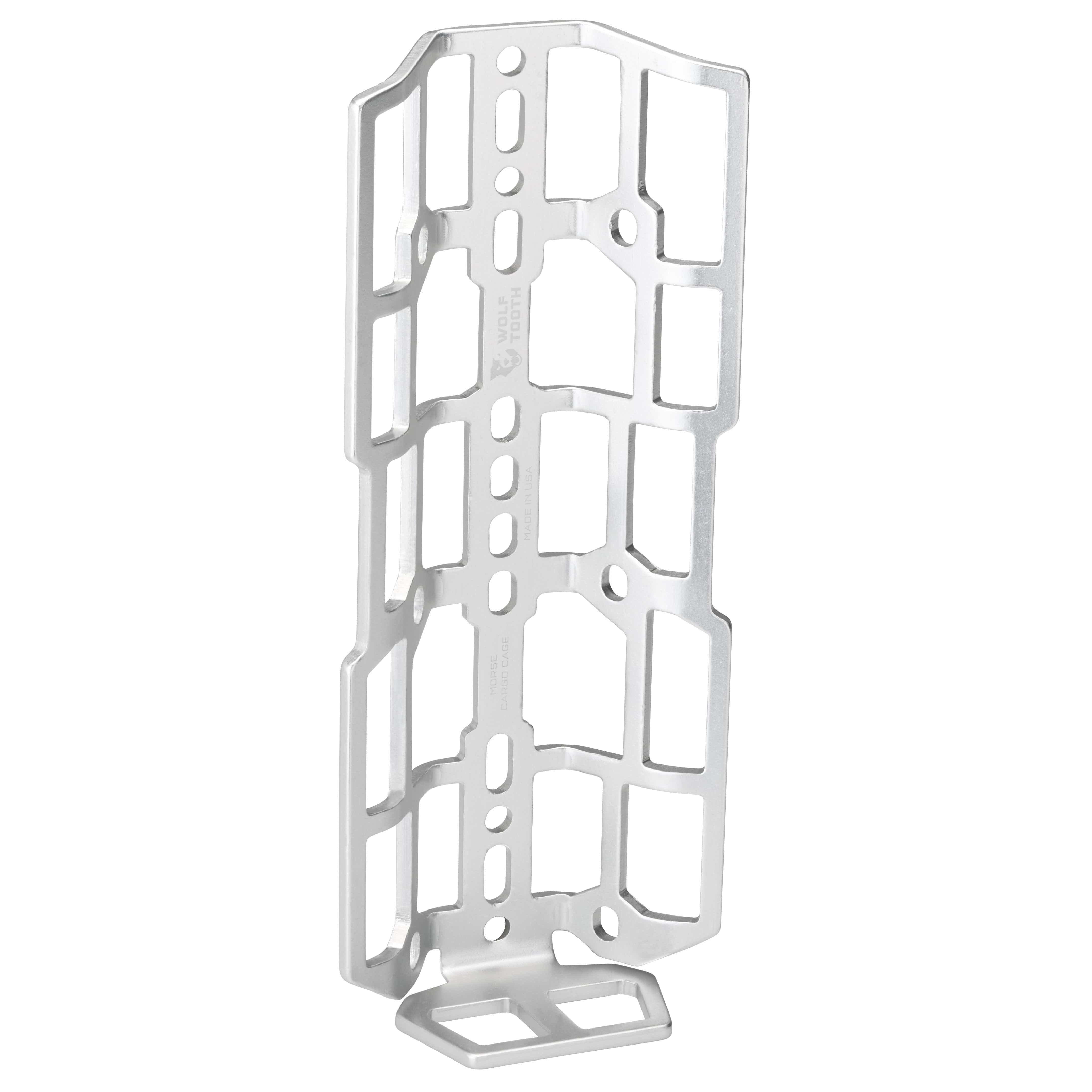 The Morse Cargo Cage is designed to increase a bike’s carrying capacity. This was created for bikepacking, self-supported races, and rides that just require more gear. The Morse name extends the popular dot-dash mounting pattern that allows for 35mm of vertical adjustment, which is also featured on Wolf Tooth Morse Bottle Cages. It will fit on a fork three-pack mount or anywhere on the frame that has bottle bosses. The Morse Cargo Cage also has bolt mounting points on the angled sides for additional versatility. It is made here in Minnesota, USA from durable, corrosion-resistant 5052 aluminum.
