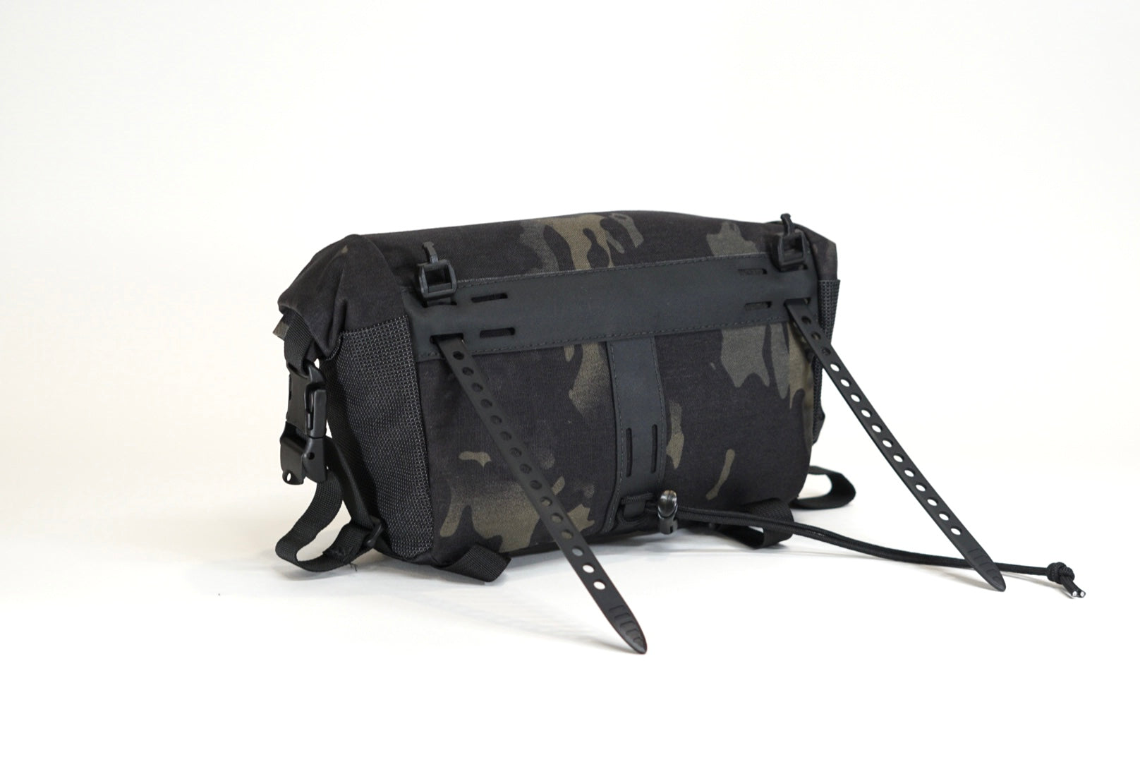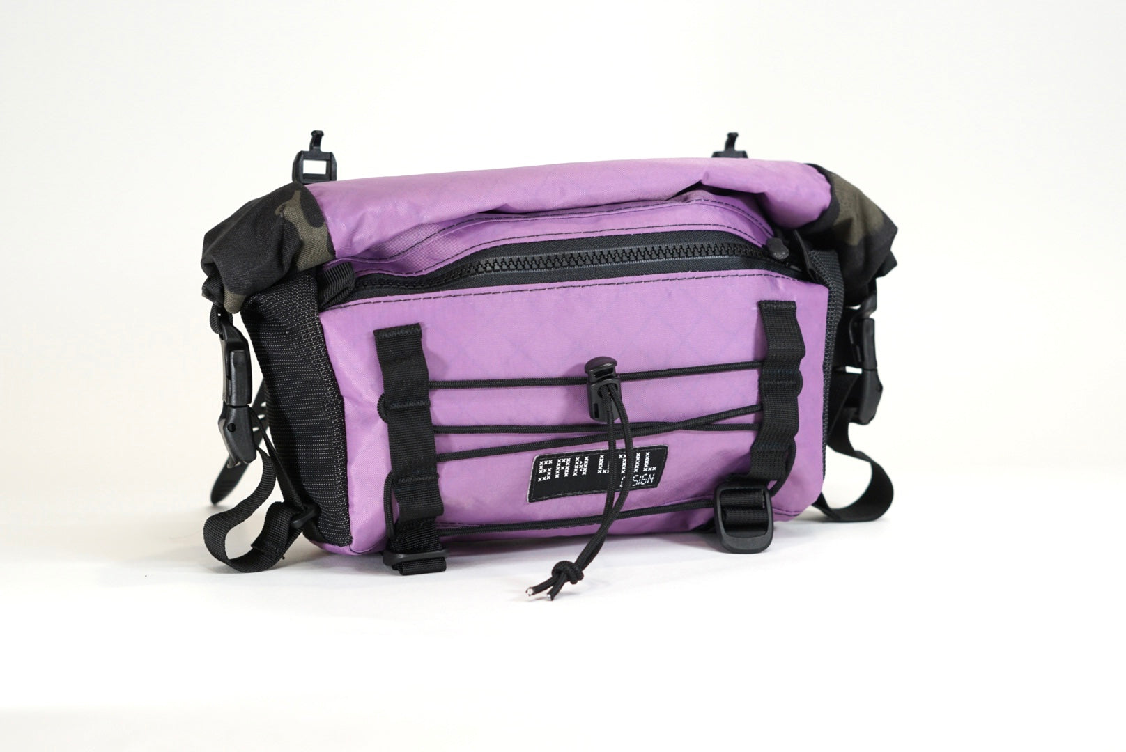 The Roly Poly is our medium size handlebar bag that is roughly 3L and overstuff-able to about 5L. Features include: side stretch pockets that are covered by the roll top "lid", a zipper front pocket, front daisy chains and adjustable loops underneath as well as 2 small drop pockets inside to separate out all the goodies.