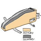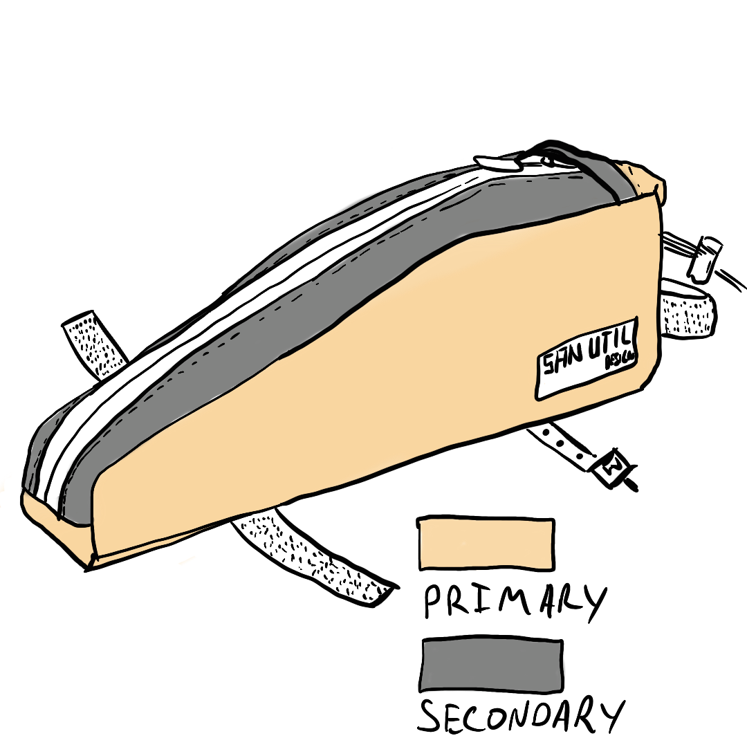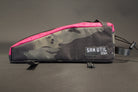 The Fault line is our standard size and shape top tube bag. It is 12" long and 4" tall. The bag tapers from 3" to 2" to allow for plenty of room for knees when you are out of the saddle cranking. The bag has stiffener in it to keep things stable when riding over rough terrain. A 9" Voile Strap is used to keep the front of the bag stable around the frame while a piece of one wrap velcro holds the back the bag down. Use a piece of shock cord to loop over or around the steerer tube and you are looking at a stable TT bag that is easy to open and close with 1 hand and looks real clean.