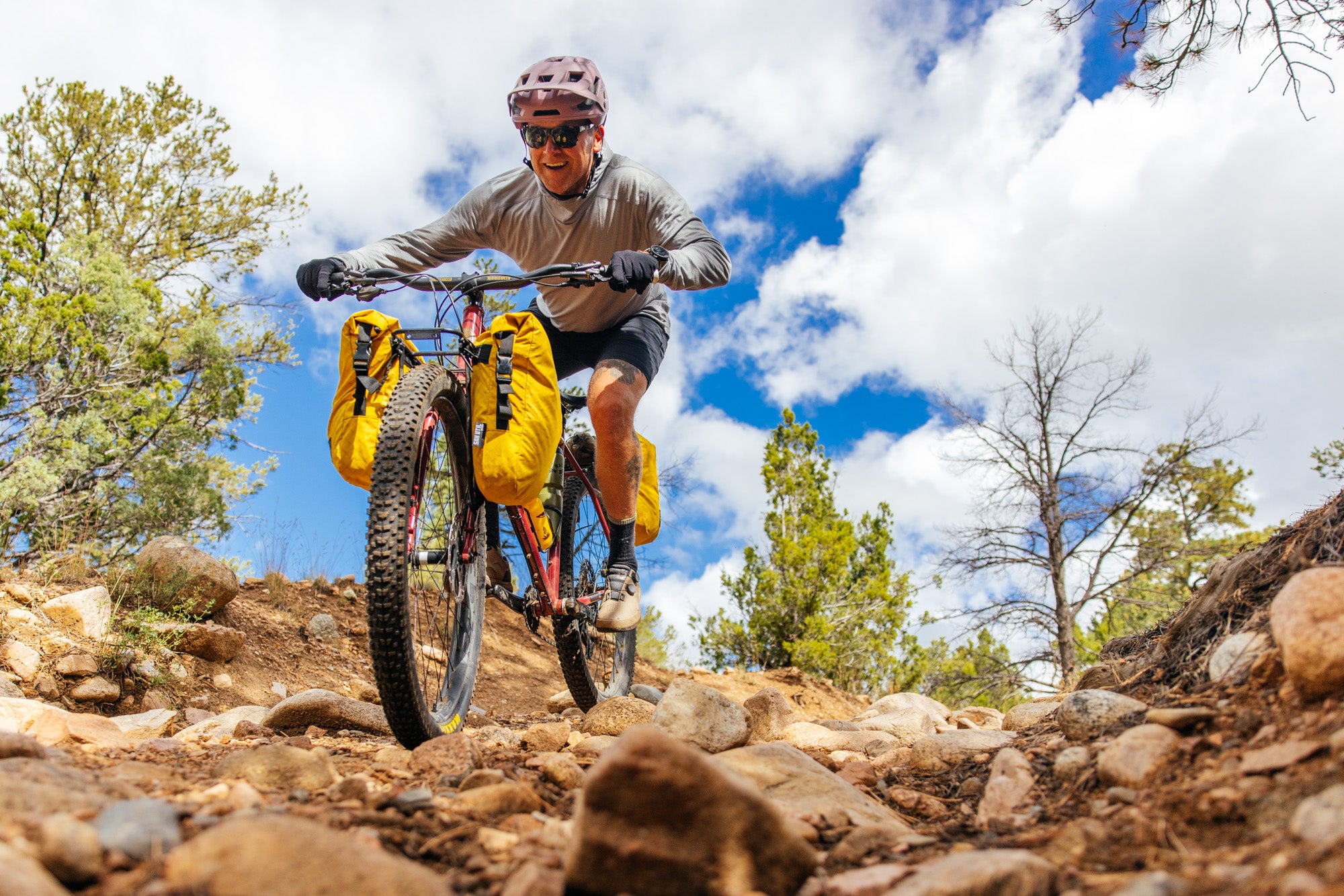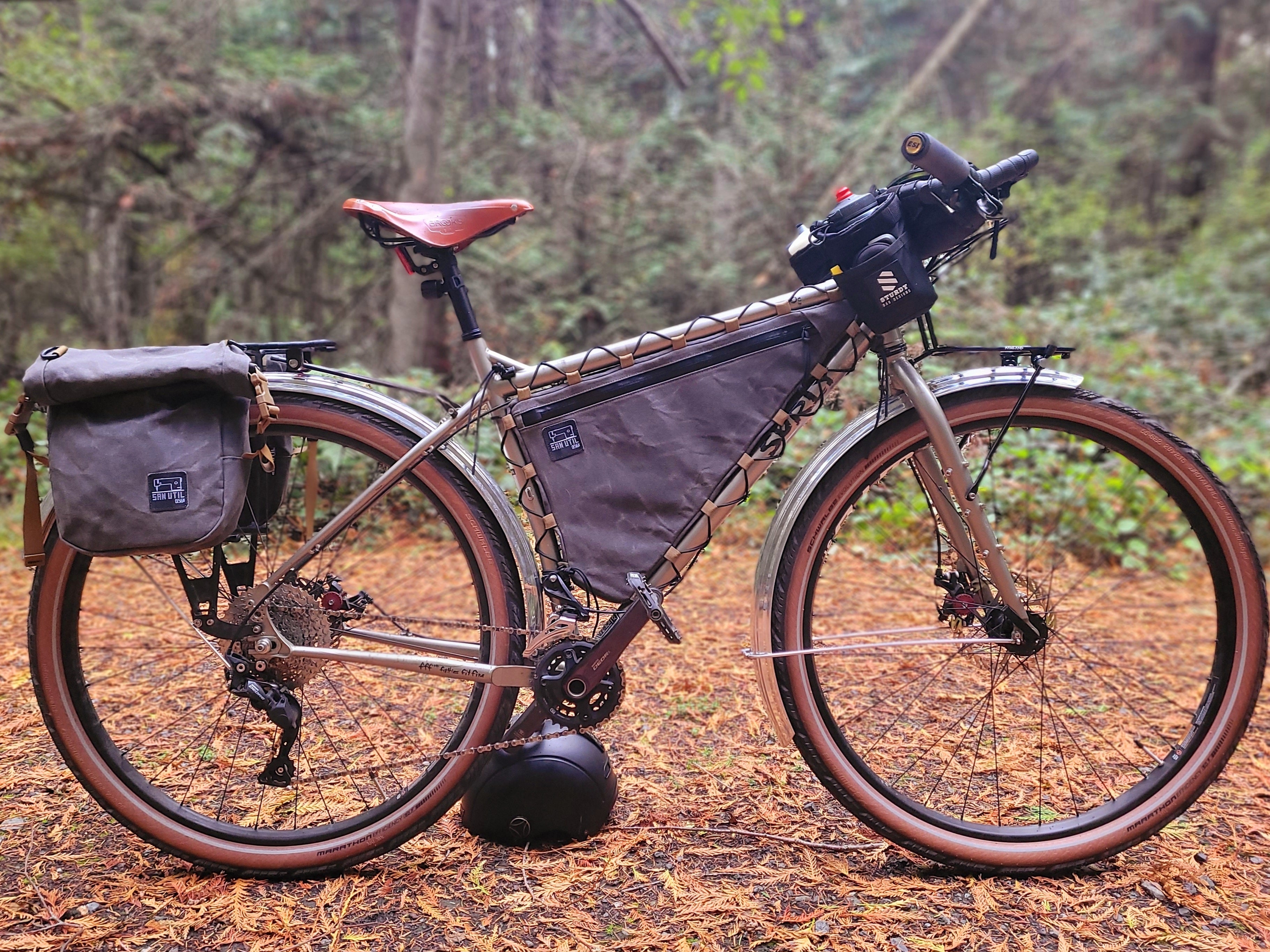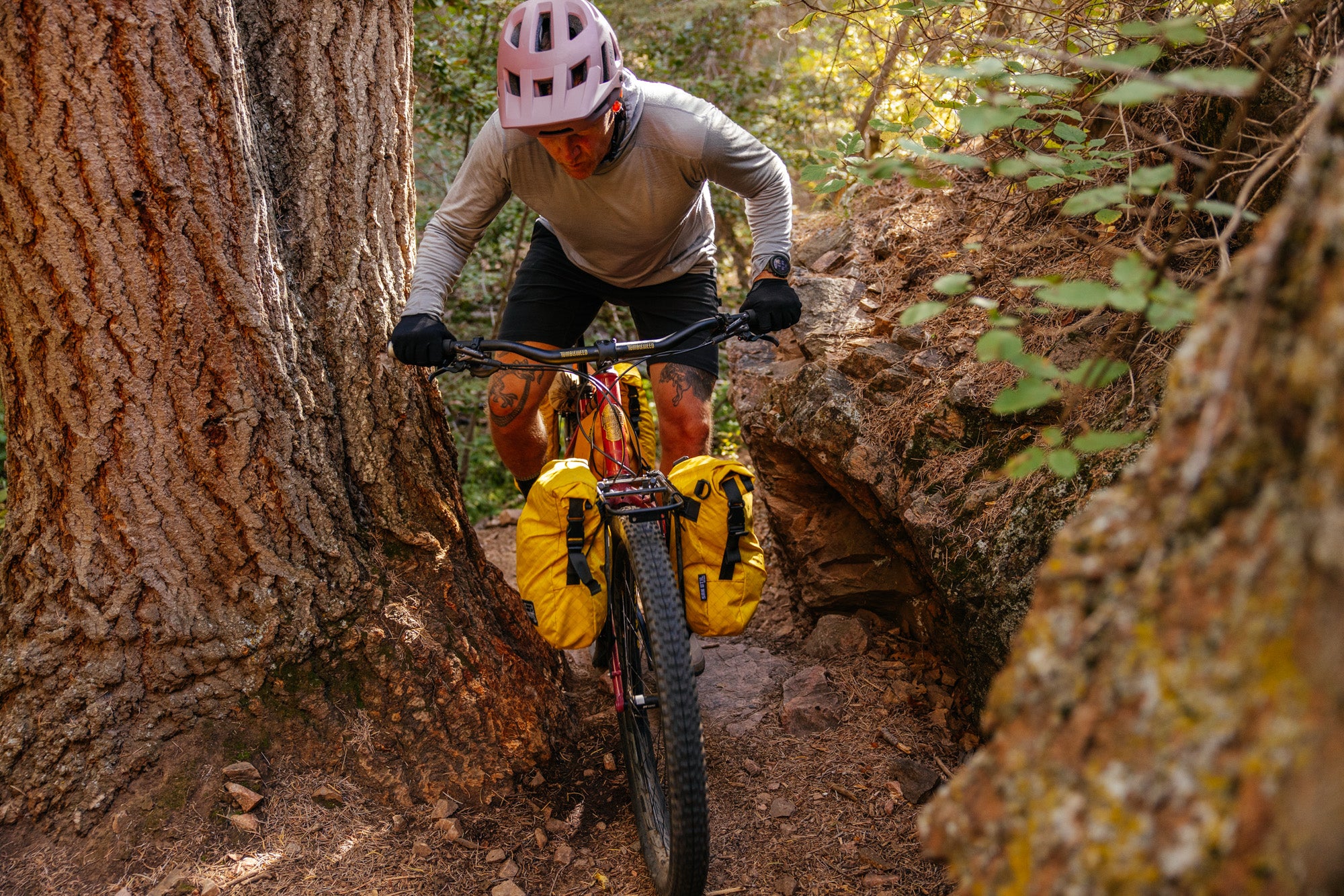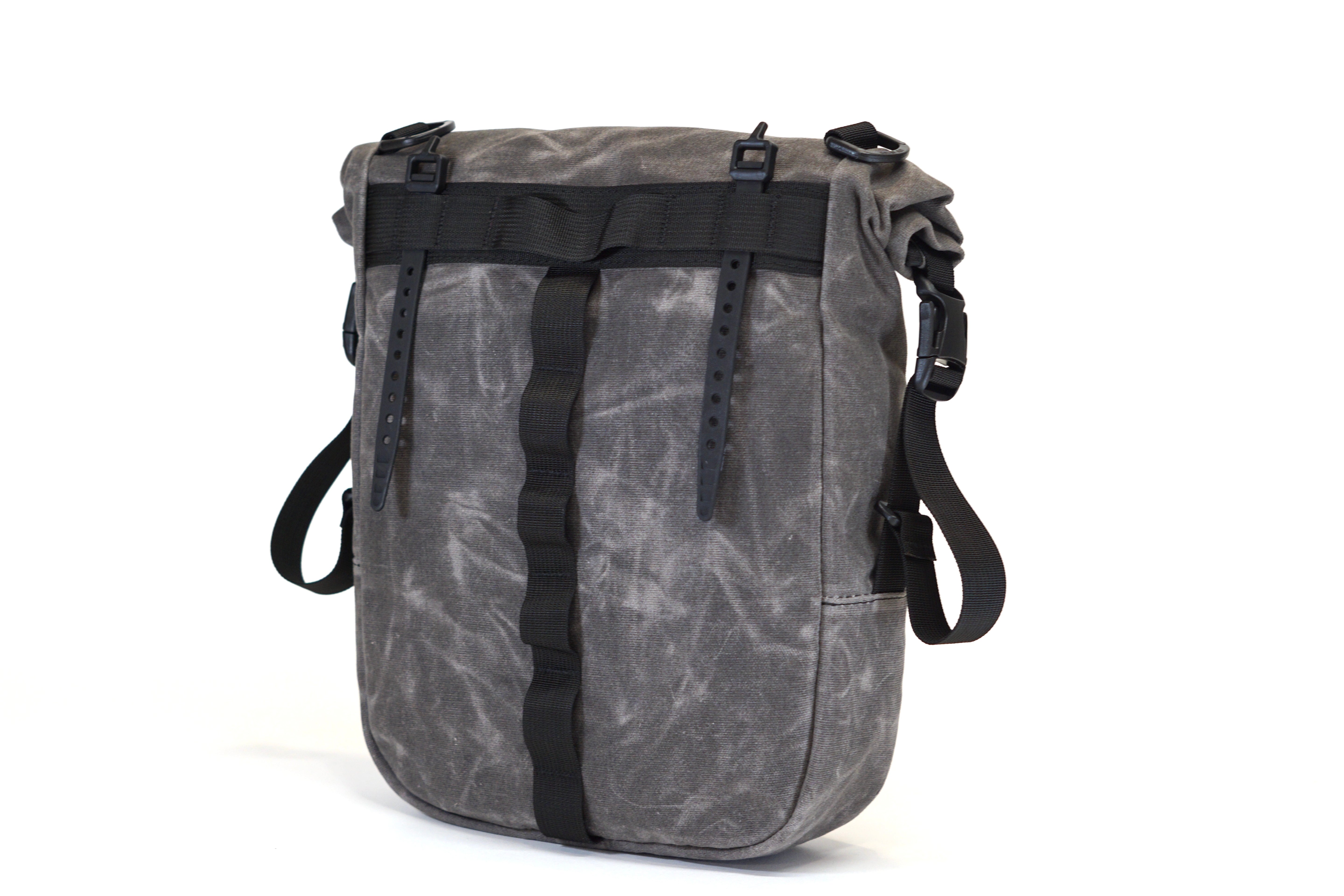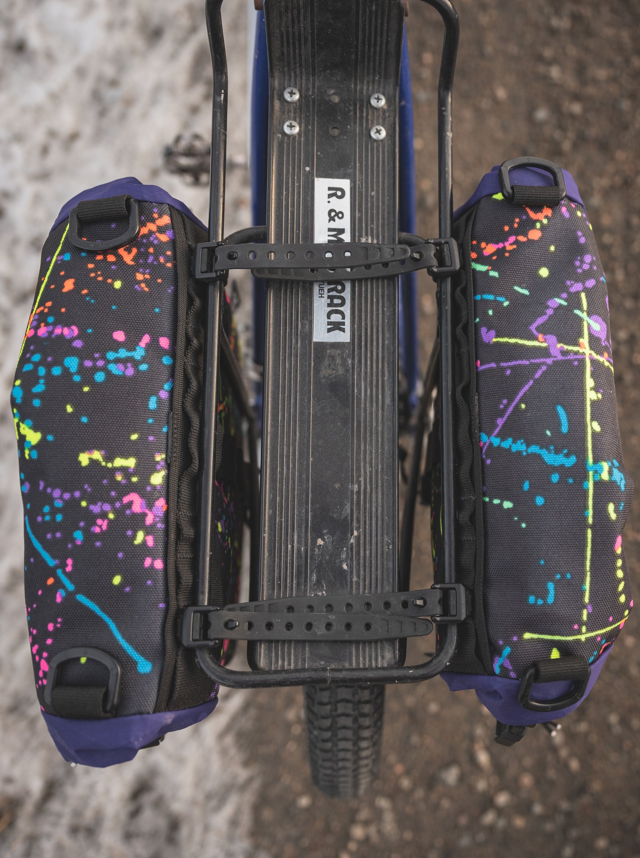 Lightweight pannier for touring and off road adventures alike. These bags are designed to be simple, durable, lightweight, and customizable. The horizontal daisy chain uses 2 Voile Straps to attach the bag to almost any rack. The vertical daisy chain helps to hold the bag in place over rough terrain. The bags are overstuff-able to roughly 12L and can be carried off the bike with a shoulder strap.
