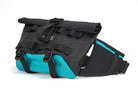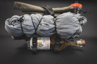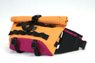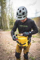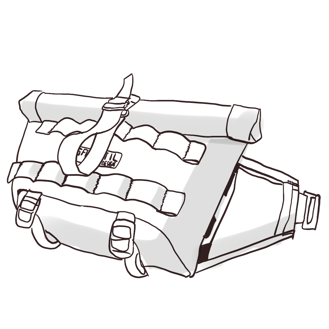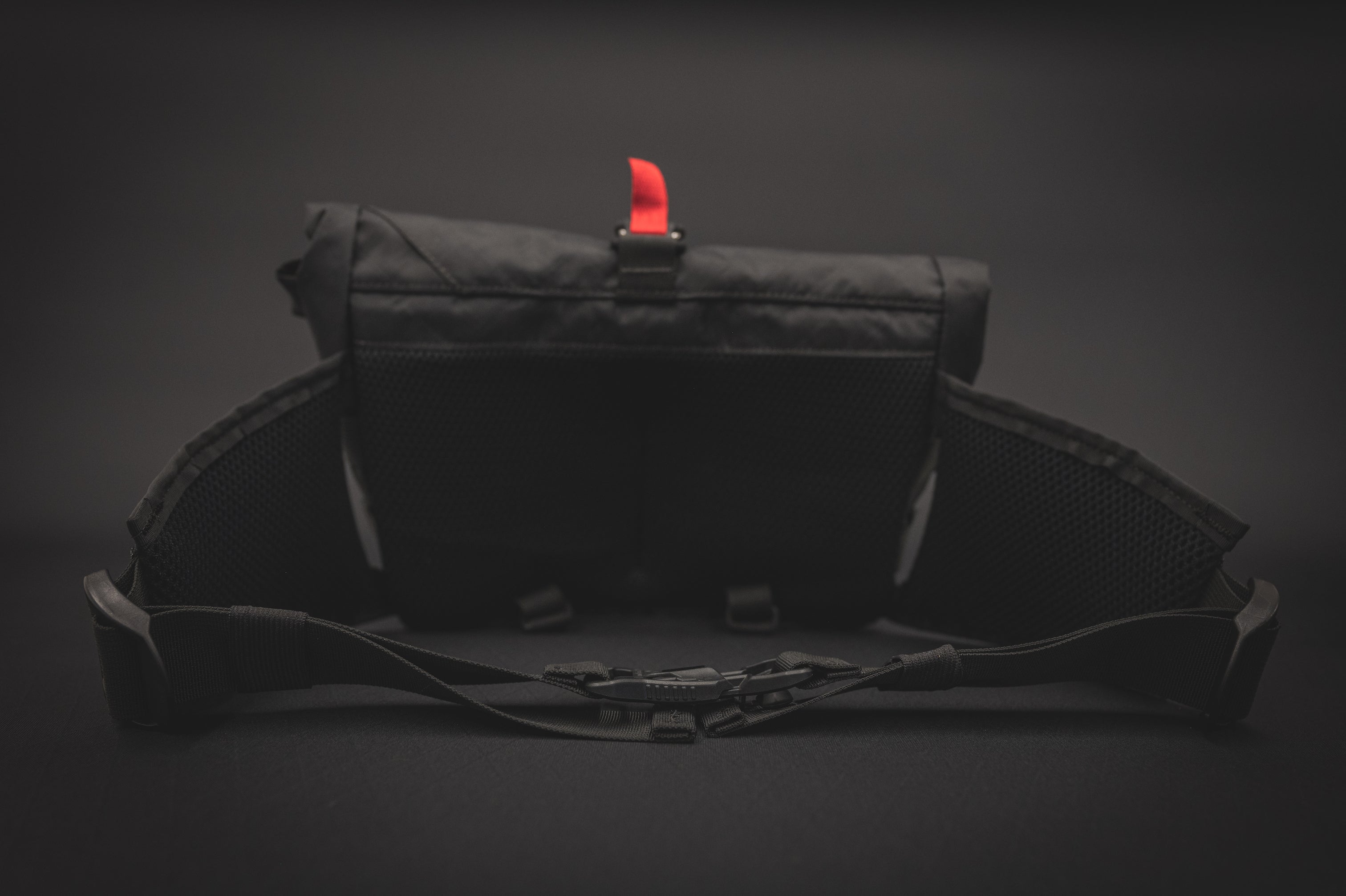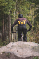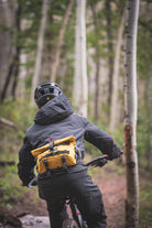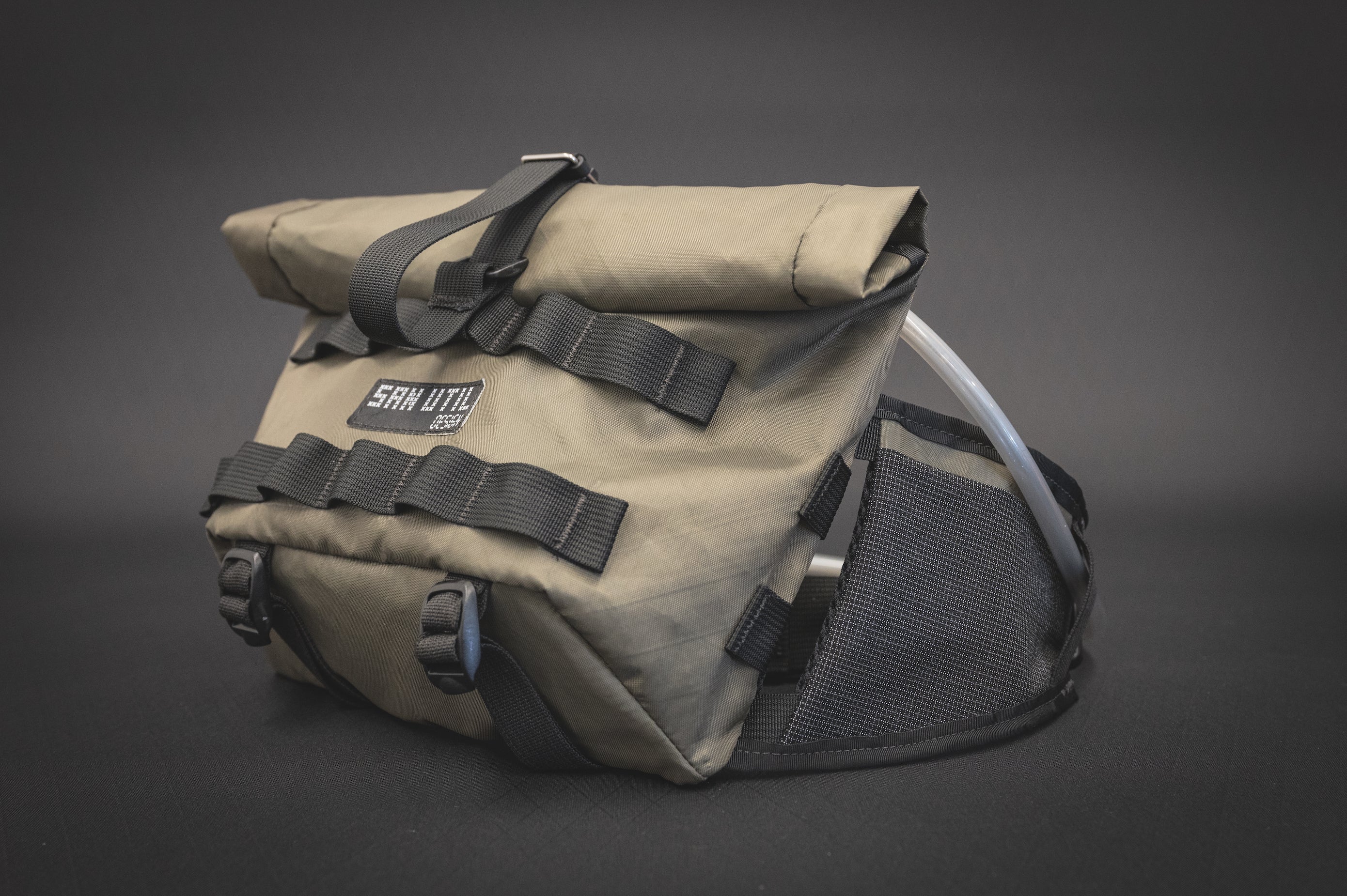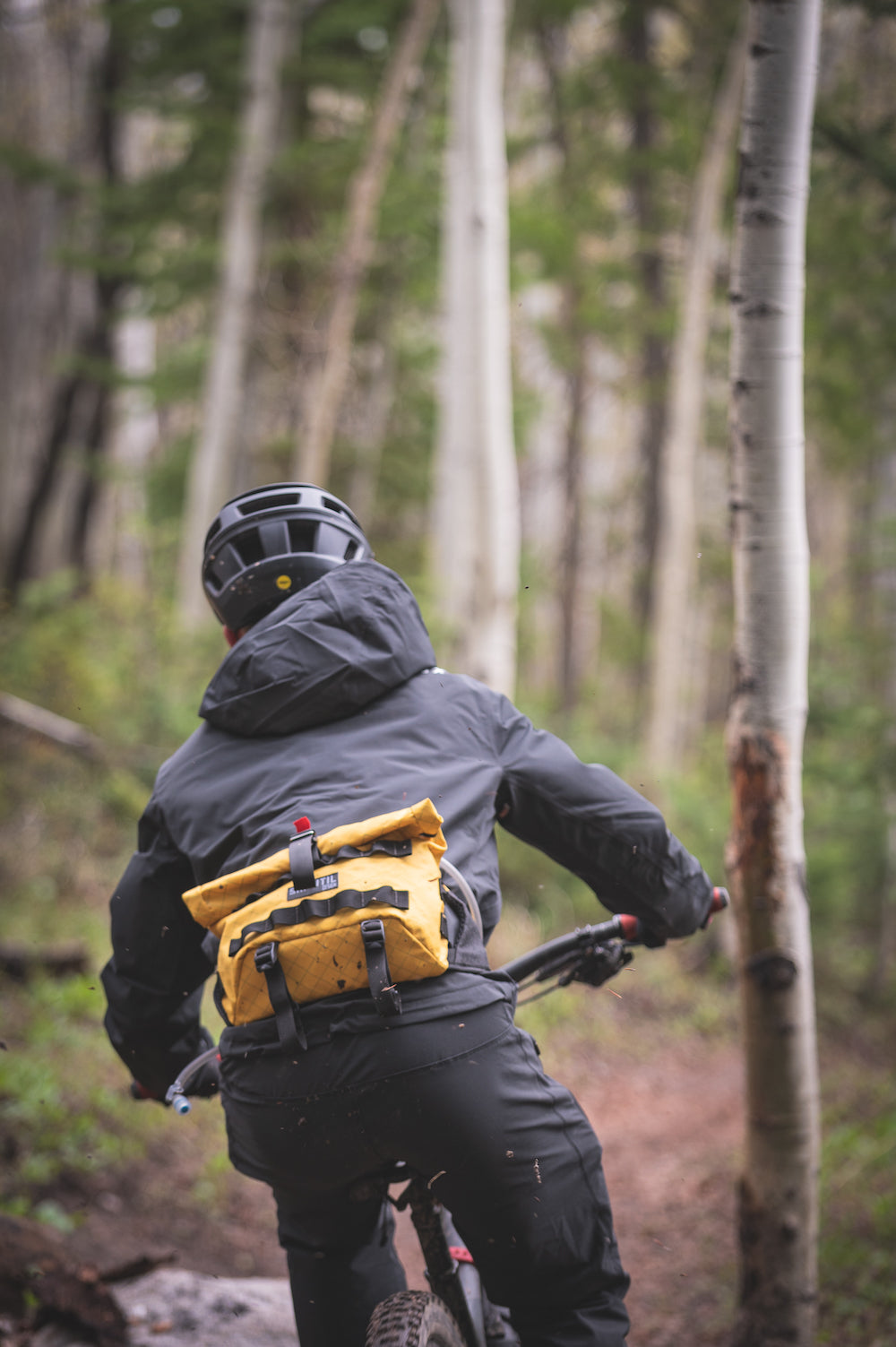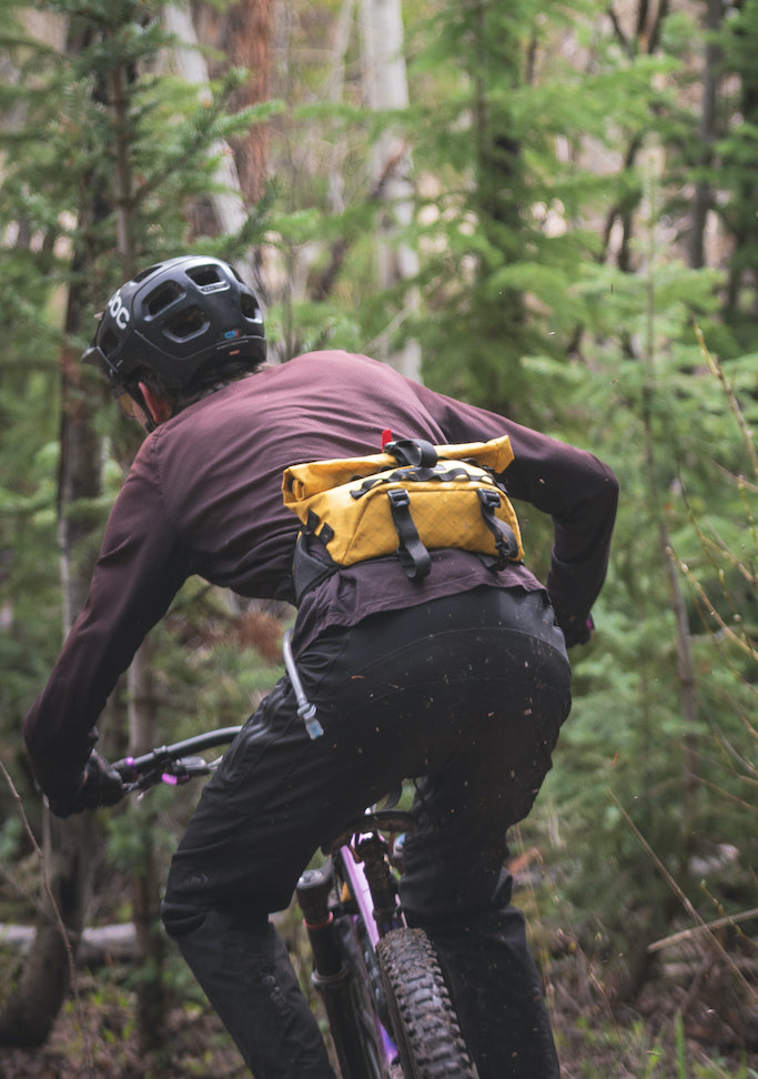 The Whirlpool Hip Pack - is the pack we wanted to be on the market but couldn’t find. It is an overstuff-able design without any zippers to blow out, sturdy seams and lot of carrying options. A removable bladder and bottle holsters lend to about 100oz of water carrying capacity (think the Whole Enchilada, Palisade Plunge, or pretty much any big enduro race). It was designed with stability, comfort, and simplicity front of mind. The name was picked because the pack is a water carrying machine and is a roll top closure, hence, The Whirlpool. Its wings are designed with as much area as we could get to help distribute the heavy water load. They are sewn in at two points per wing to give them the flexibility to move to the body of the rider. We also tilted the wings up some so the pack sits lower on the back. This helps when in a riding position, keeping the waist belt low. The daisy chain webbing on the back is the perfect spot to strap a coat, carabiner you coffee mug, or clip some sunscreen. You can also put the arms of your sunglasses through the webbing if you need a place to let them air out.