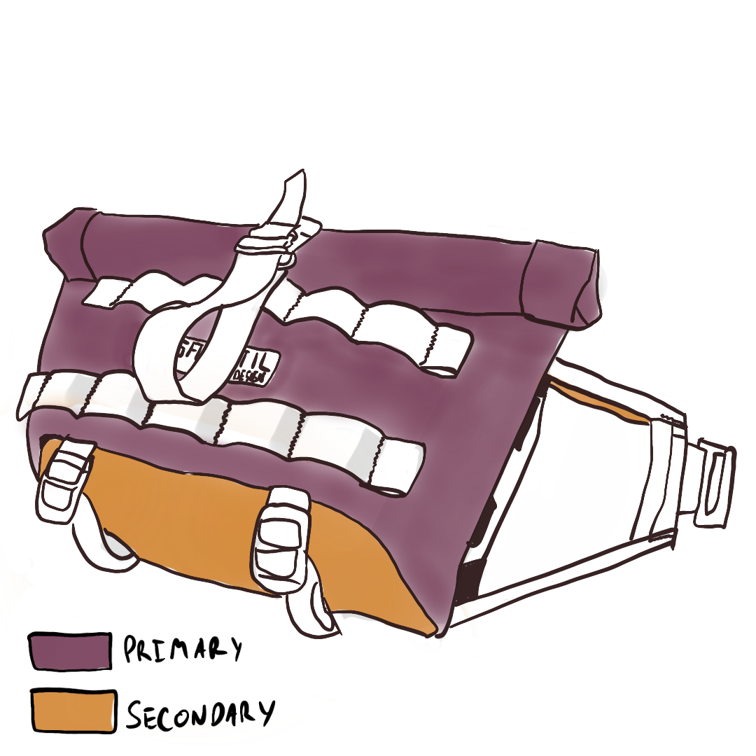 Primary color is the main section of the pack. Secondary is the bottom (where the straps are) and the wings under the drop pockets. Webbing is the webbing... Check out our super sophisticated drawing to see what colors go where.