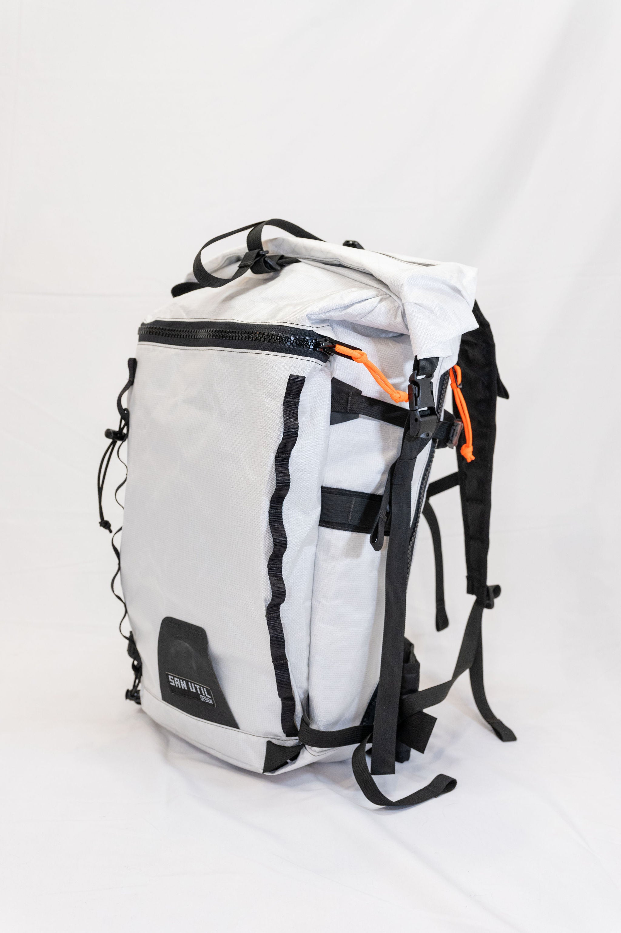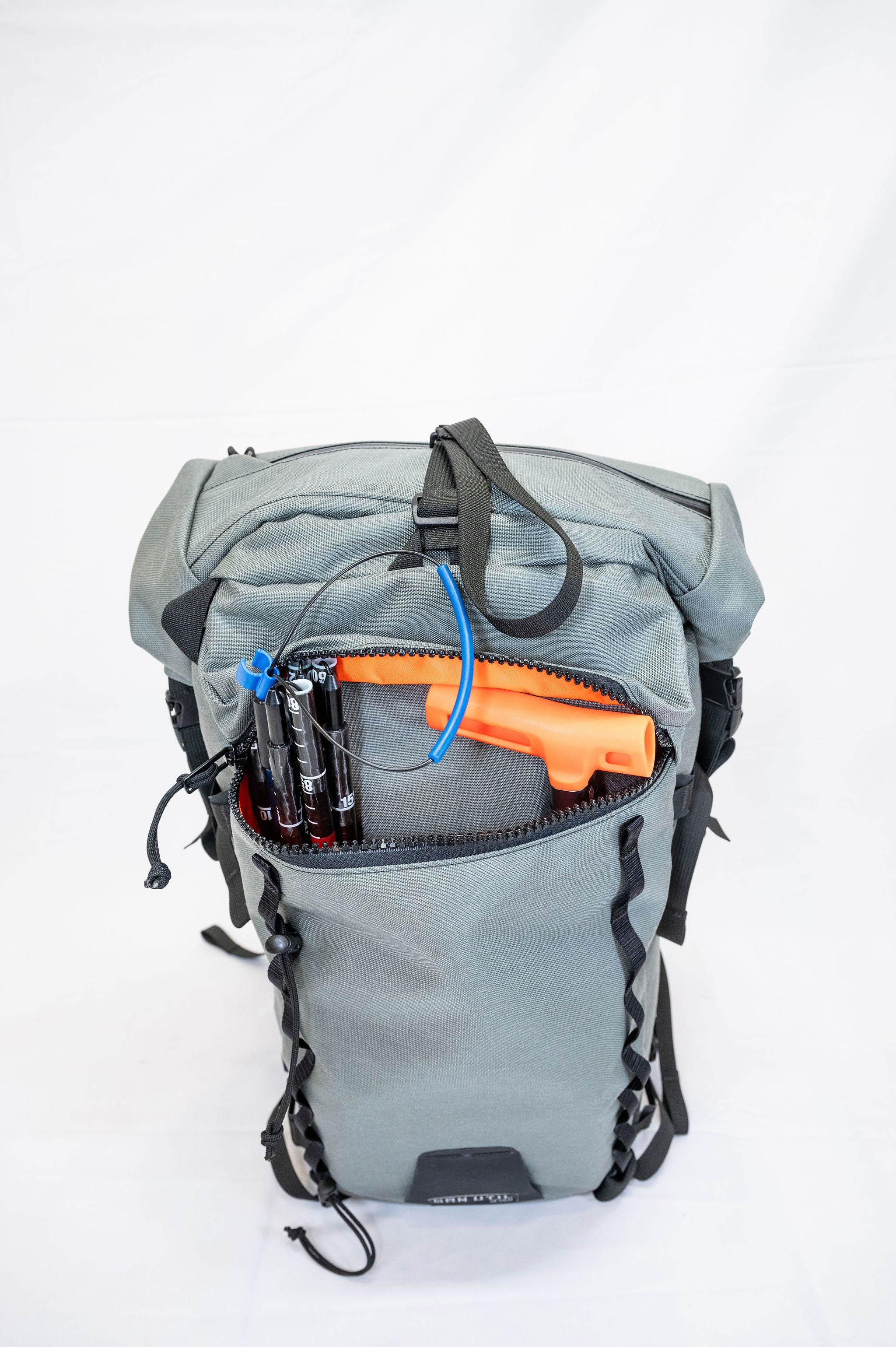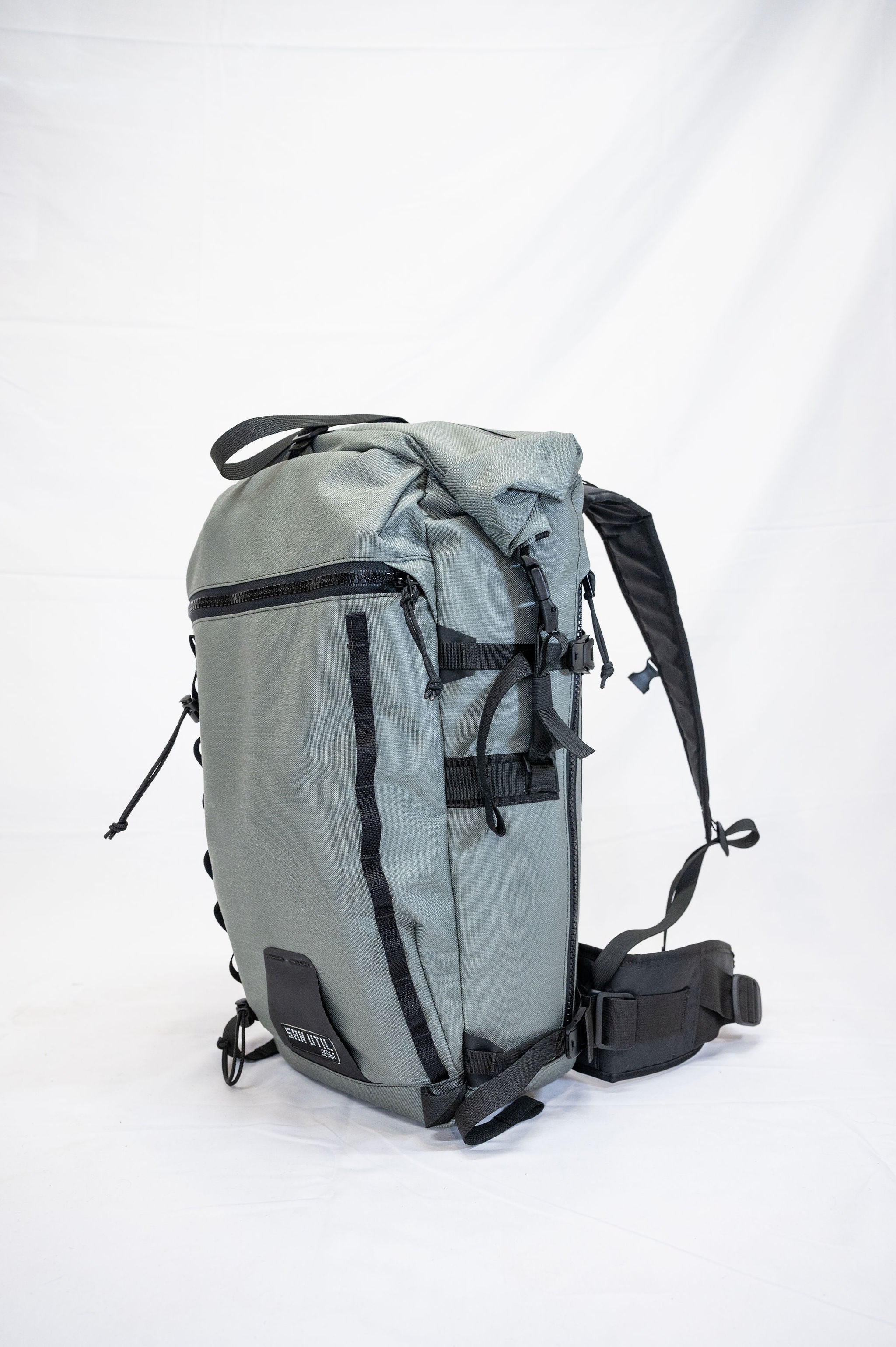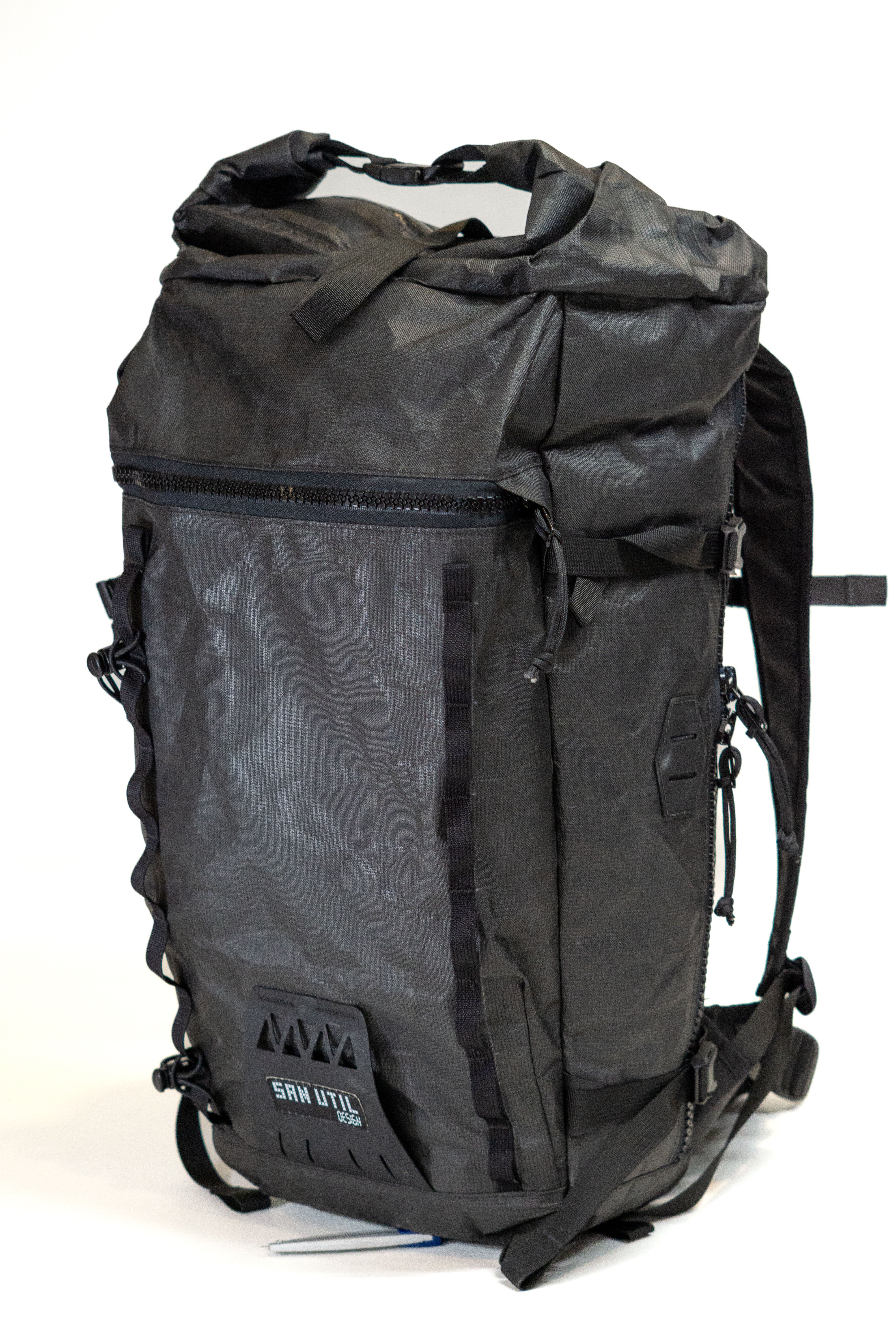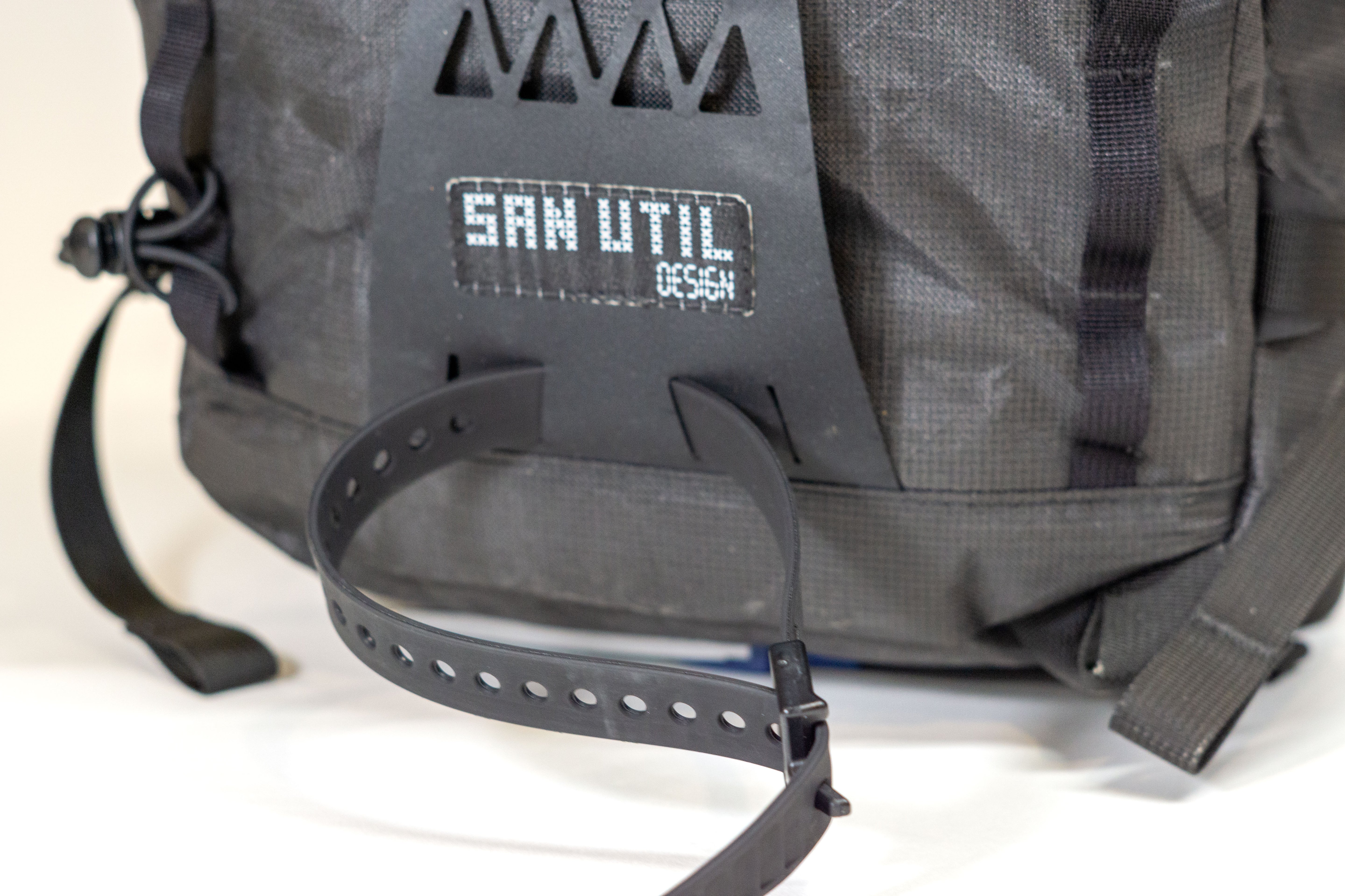 The pack is a roll top design with a zipper pocket on top for a radio or tools. The production version of the pack will have a vertical zipper down the right side panel of the pack to allow access to the pack while it is still rolled. There is a CSM (formerly Hypalon) ice axe/tool cover on the center of the pack where the current San Util tag is.