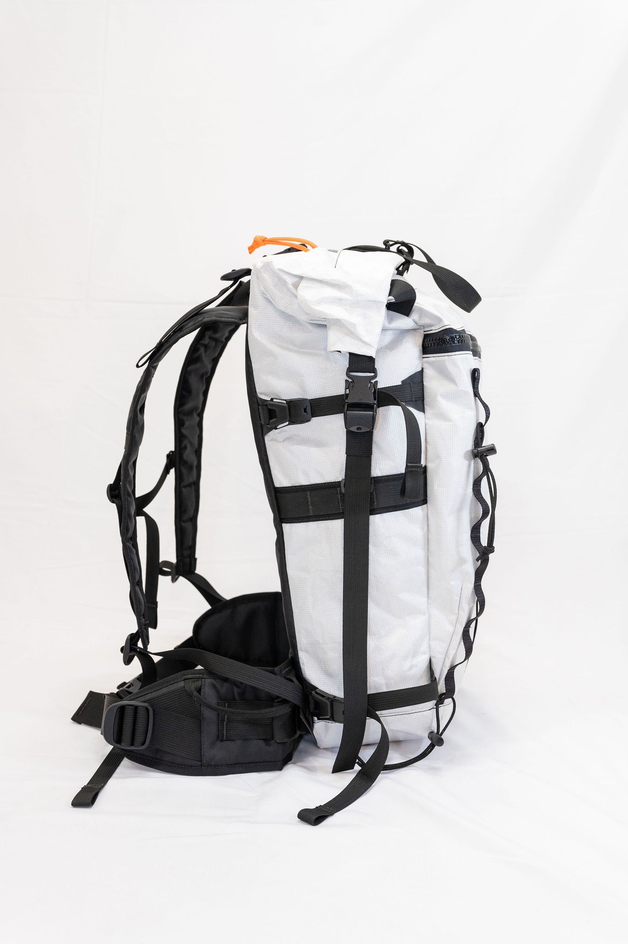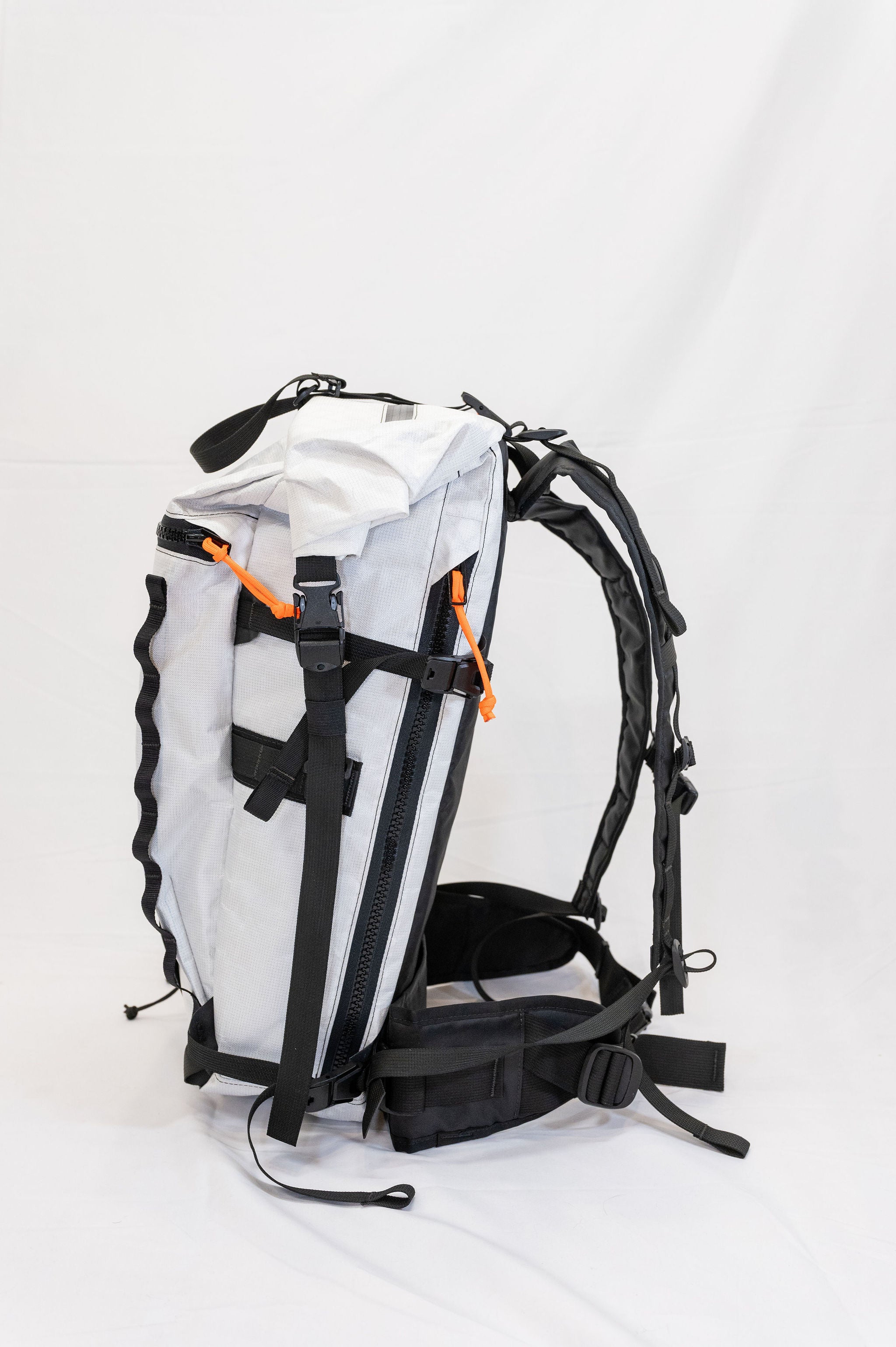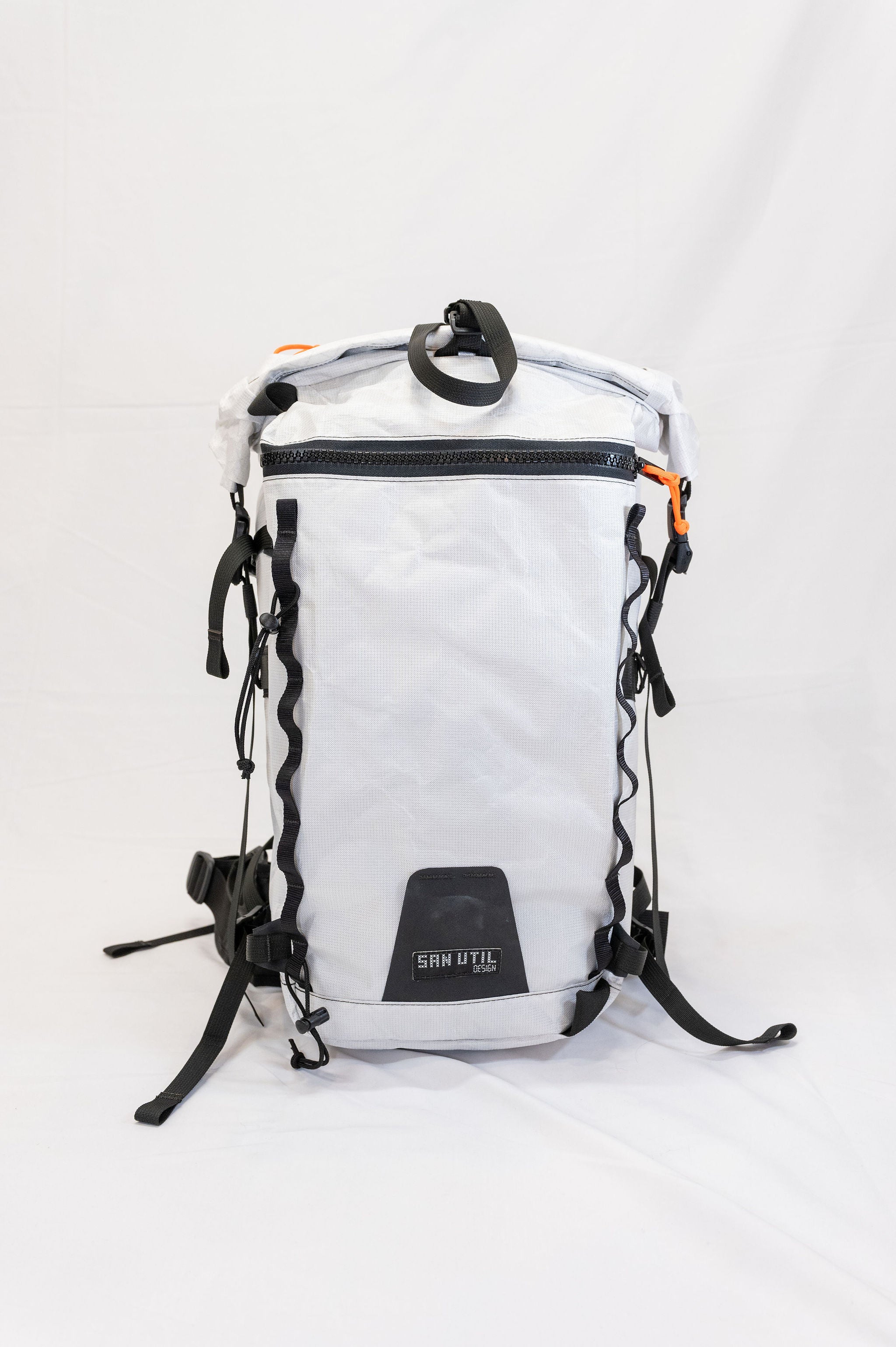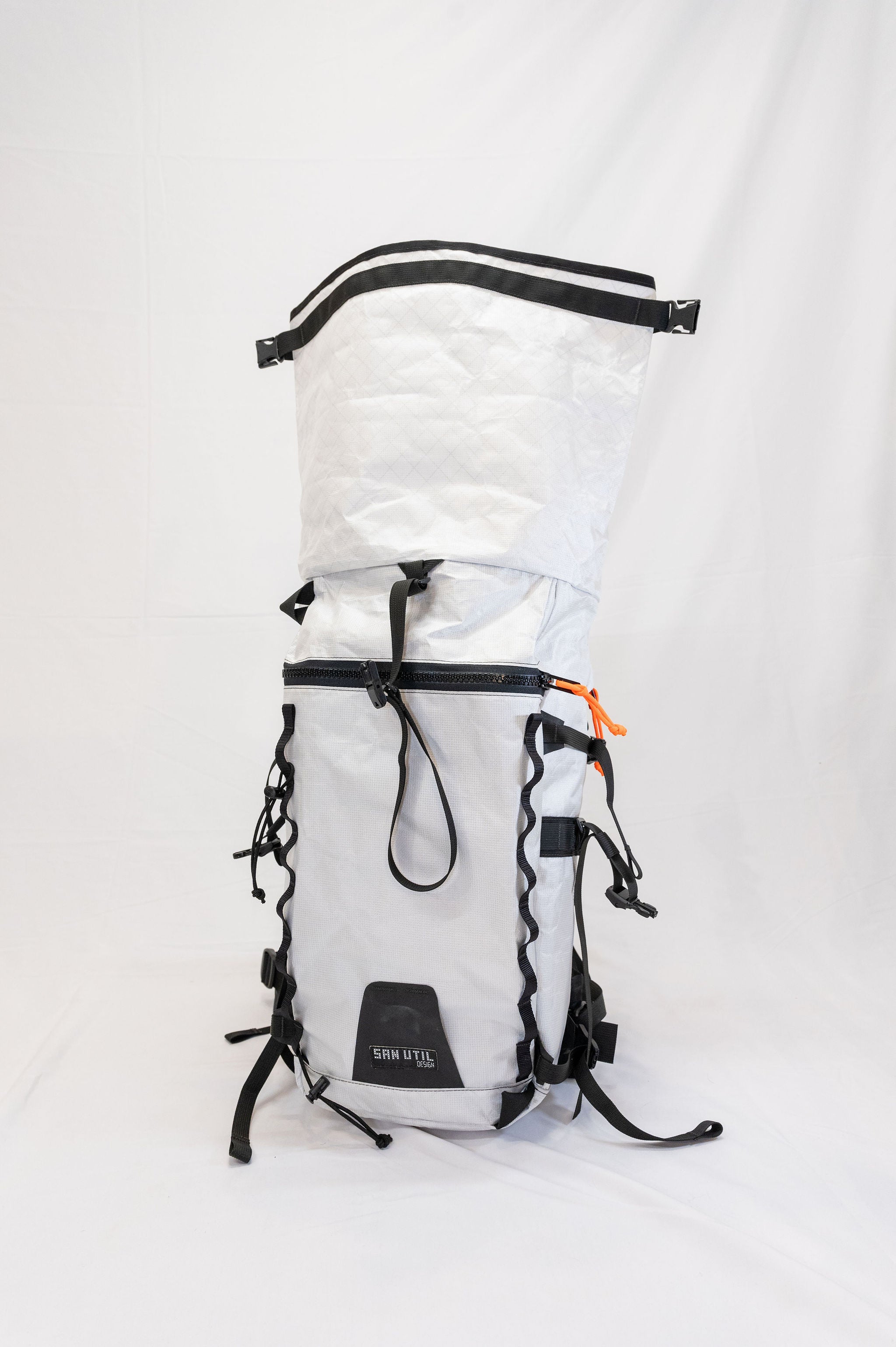 The pack is a roll top design with a zipper pocket on top for a radio or tools. The production version of the pack will have a vertical zipper down the right side panel of the pack to allow access to the pack while it is still rolled. There is a CSM (formerly Hypalon) ice axe/tool cover on the center of the pack where the current San Util tag is.