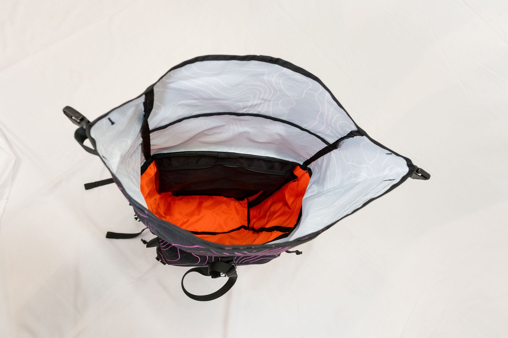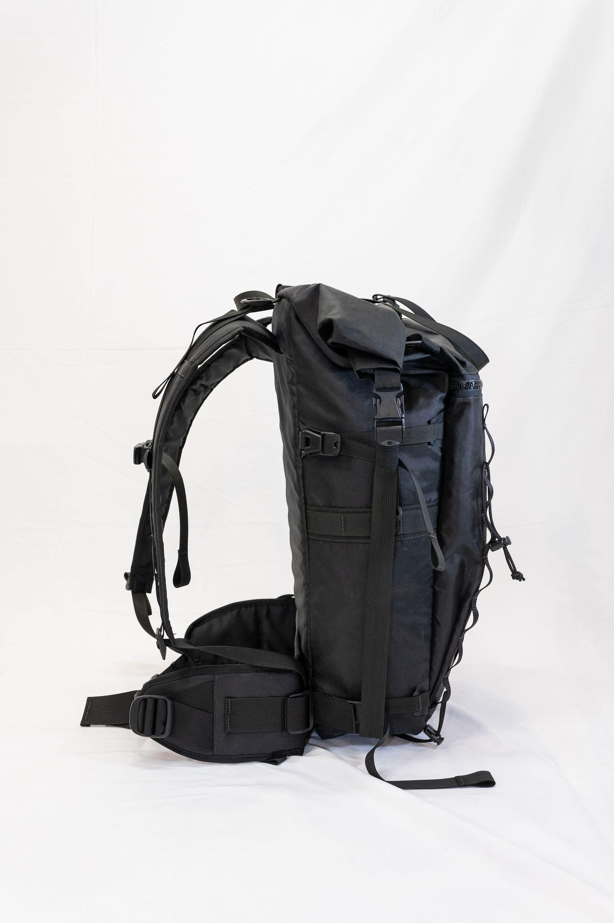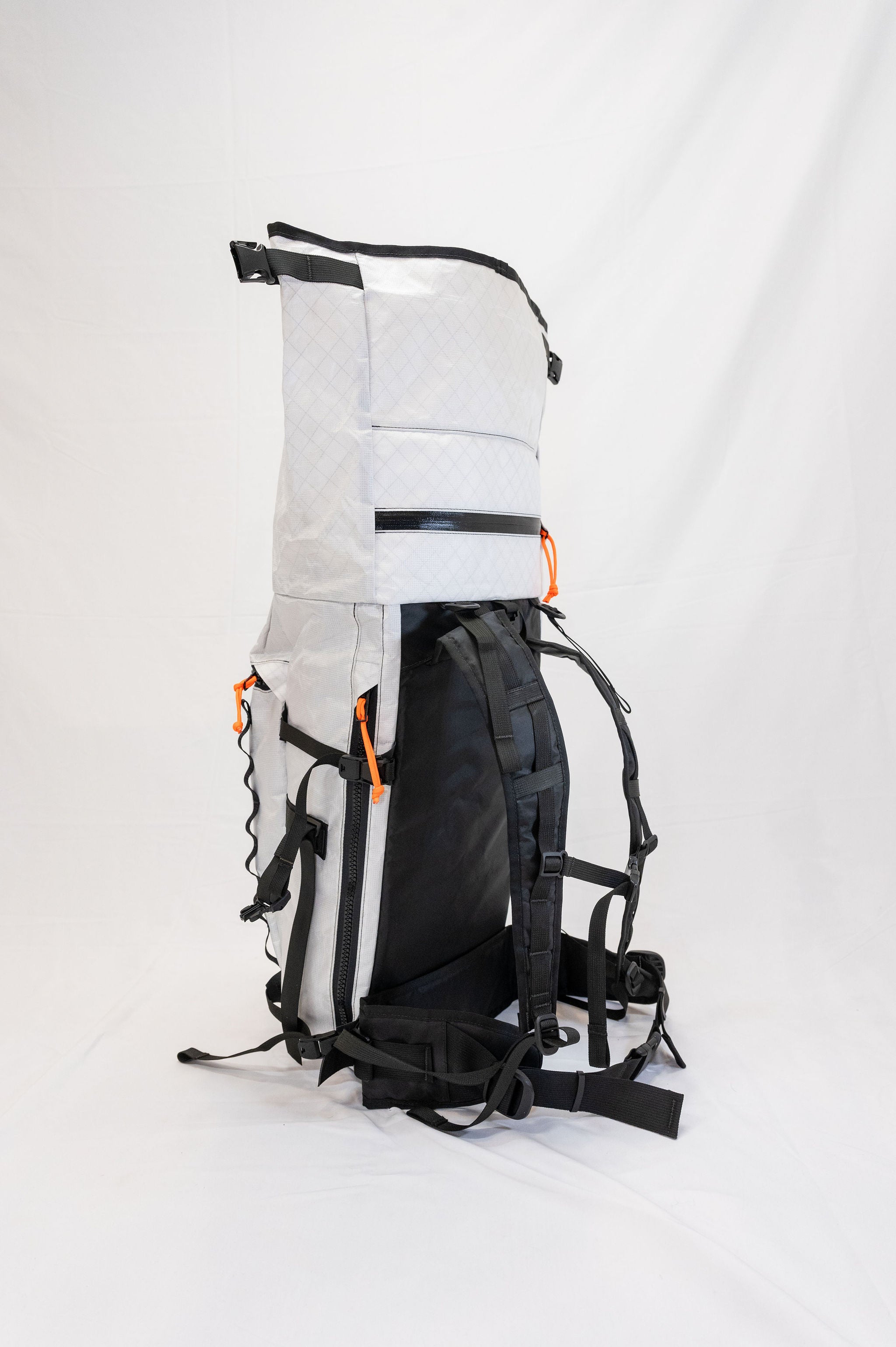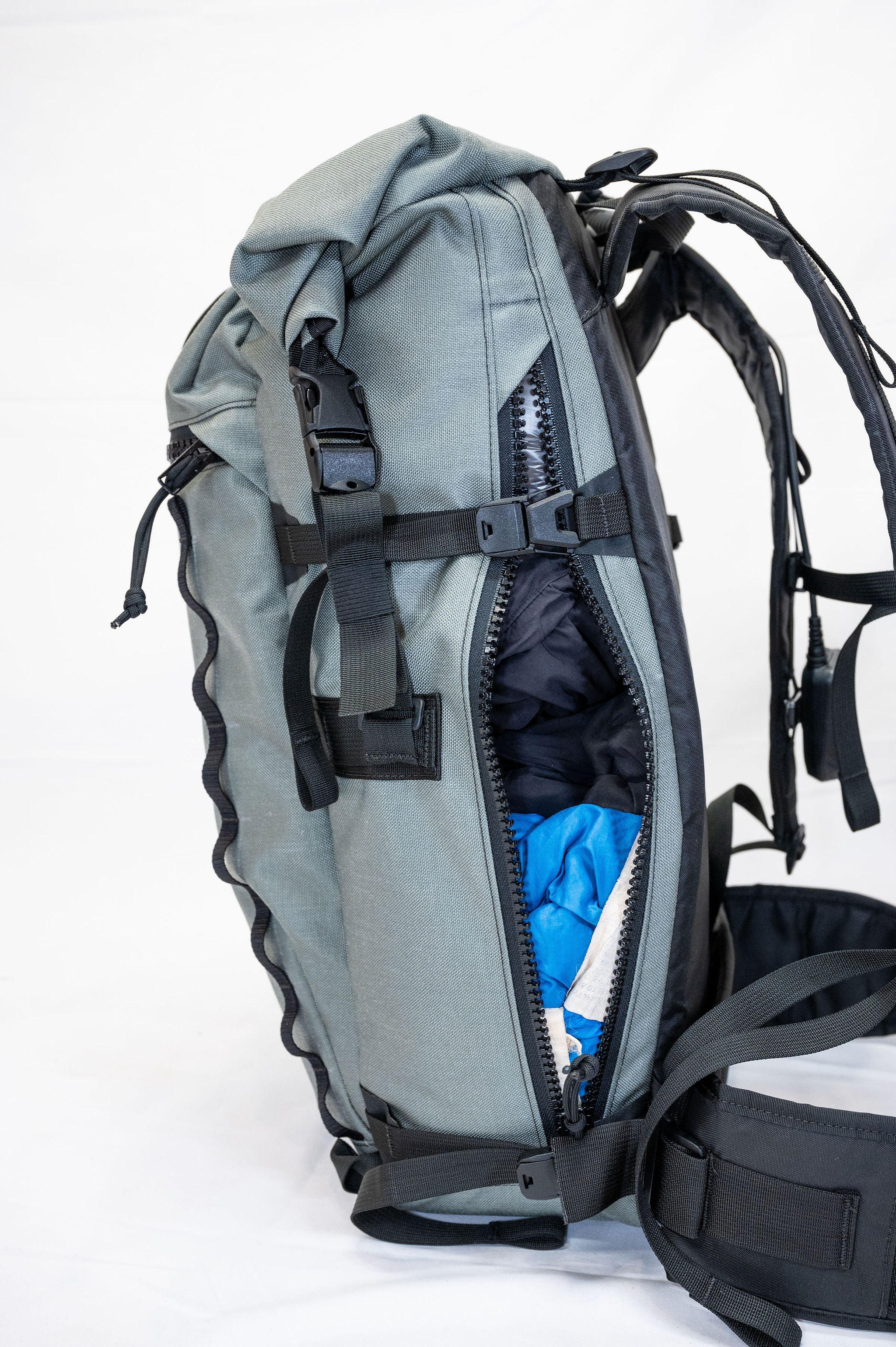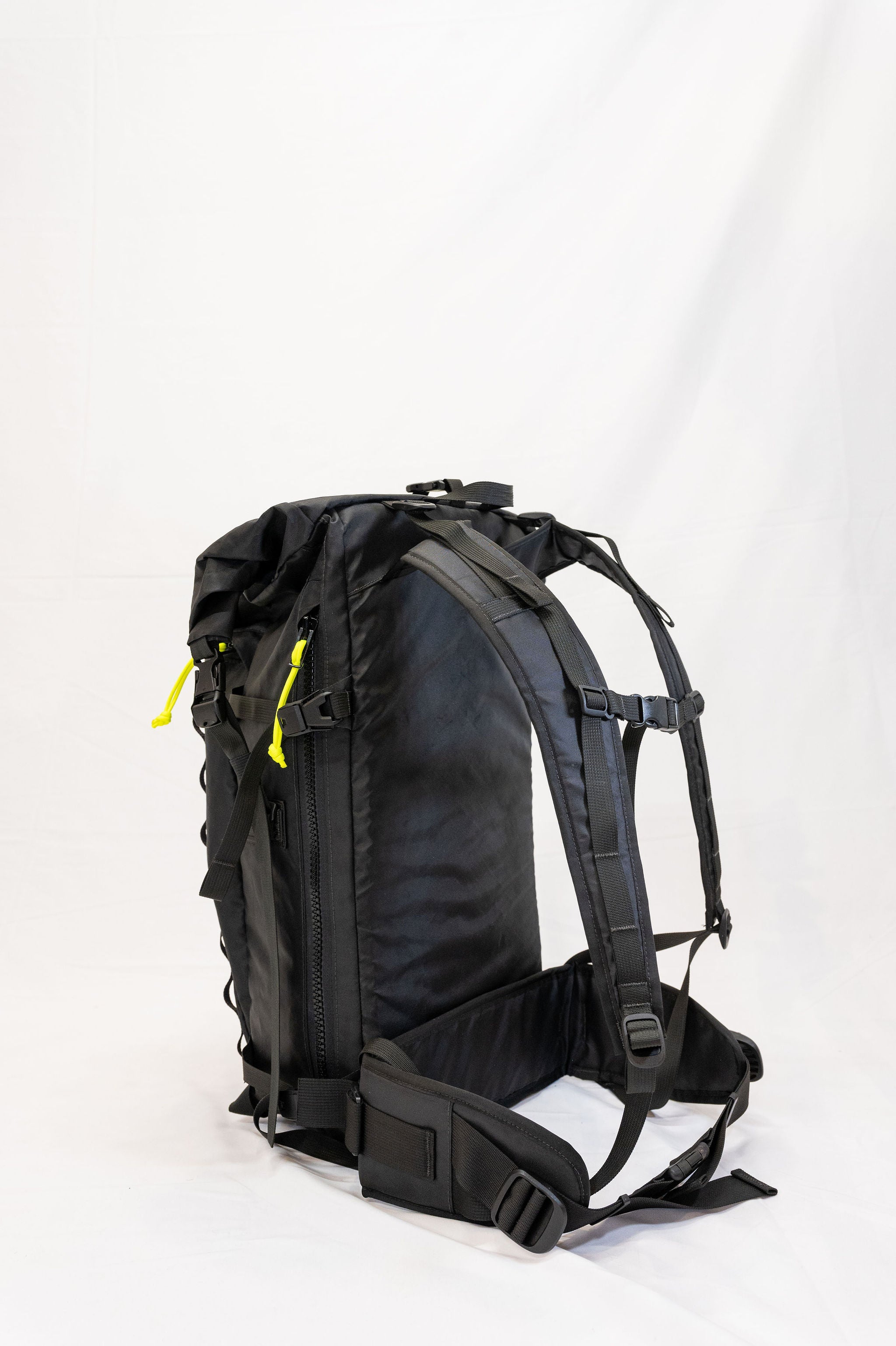 The pack is a roll top design with a zipper pocket on top for a radio or tools. The production version of the pack will have a vertical zipper down the right side panel of the pack to allow access to the pack while it is still rolled. There is a CSM (formerly Hypalon) ice axe/tool cover on the center of the pack where the current San Util tag is.