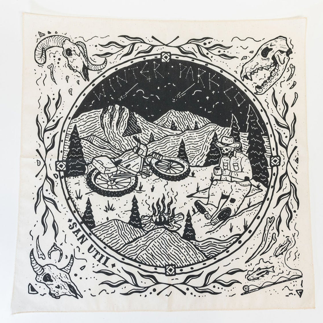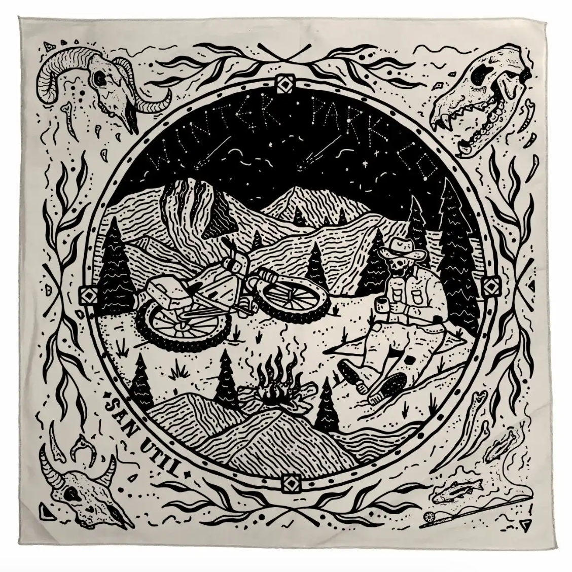 Celebrate the spirit of adventure with our Bear Claw Bandana, featuring an original illustration of Perry’s Peak (Bear Claw) and a classic bikepacking camp setup. Designed for riders and explorers alike, this bandana blends art and utility—whether you’re on the trail, around the campfire, or out in town.