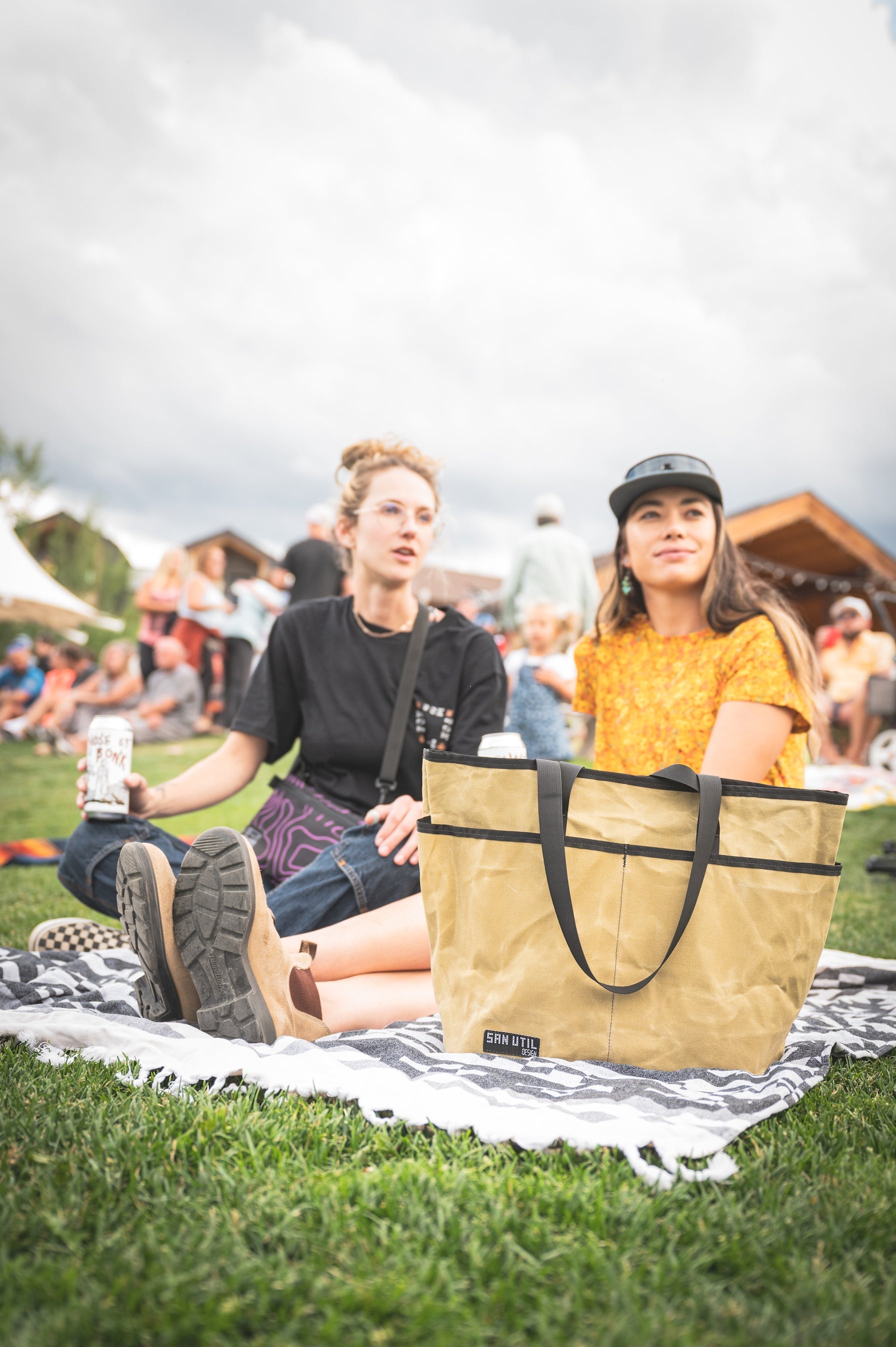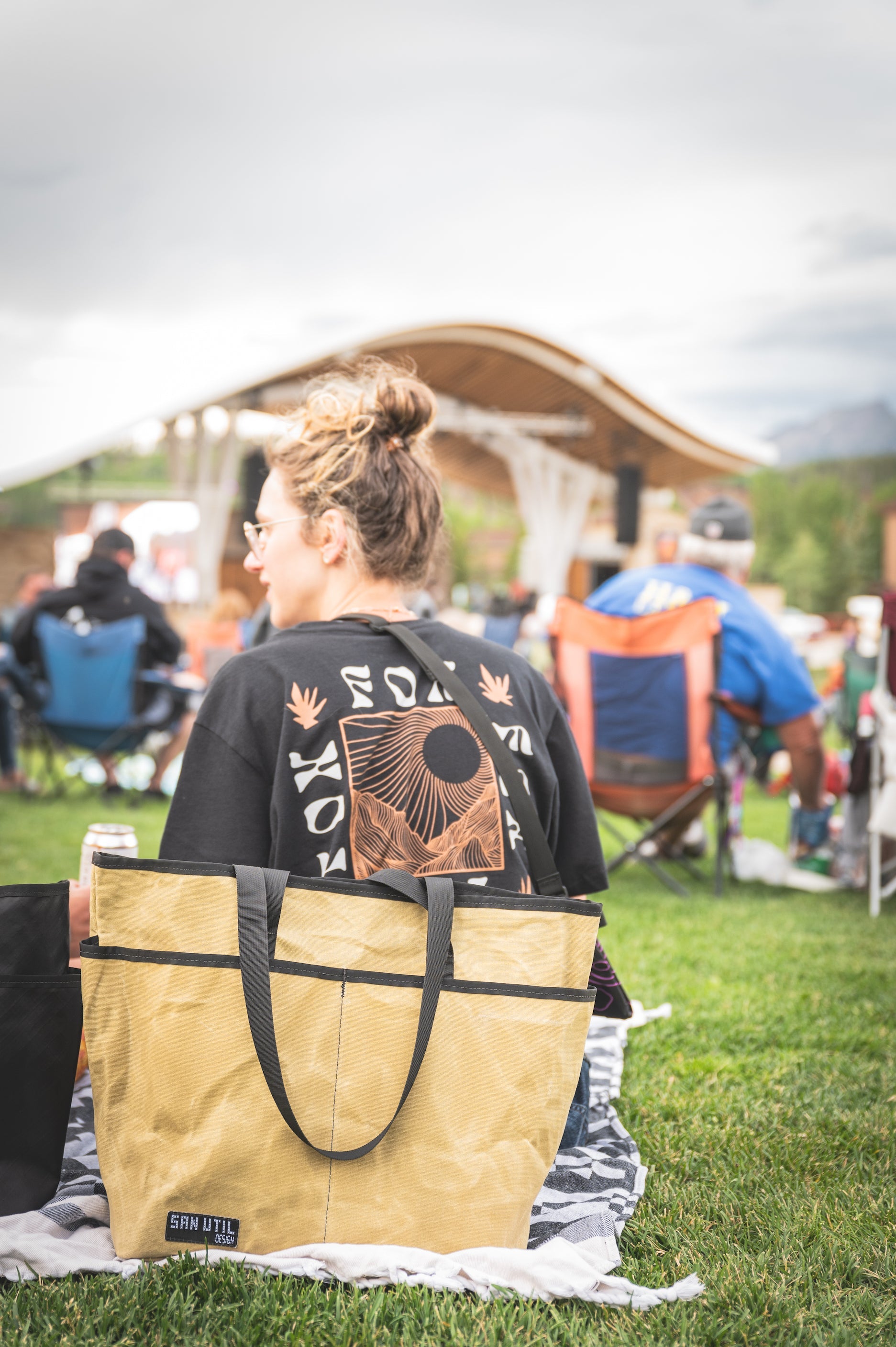 Born from music in the park on Thursday nights. This tote bag is perfect to shoulder carry a blanket, some beers, and dinner down through town and to the park. Two drop pockets on the outside help to keep things organized and an internal zipper pocket makes sure you have your essentials (ID and Cash for beerzzz).