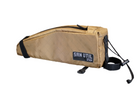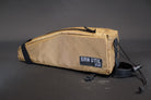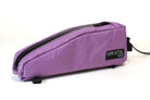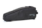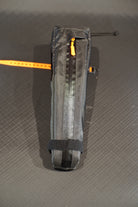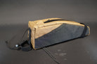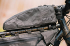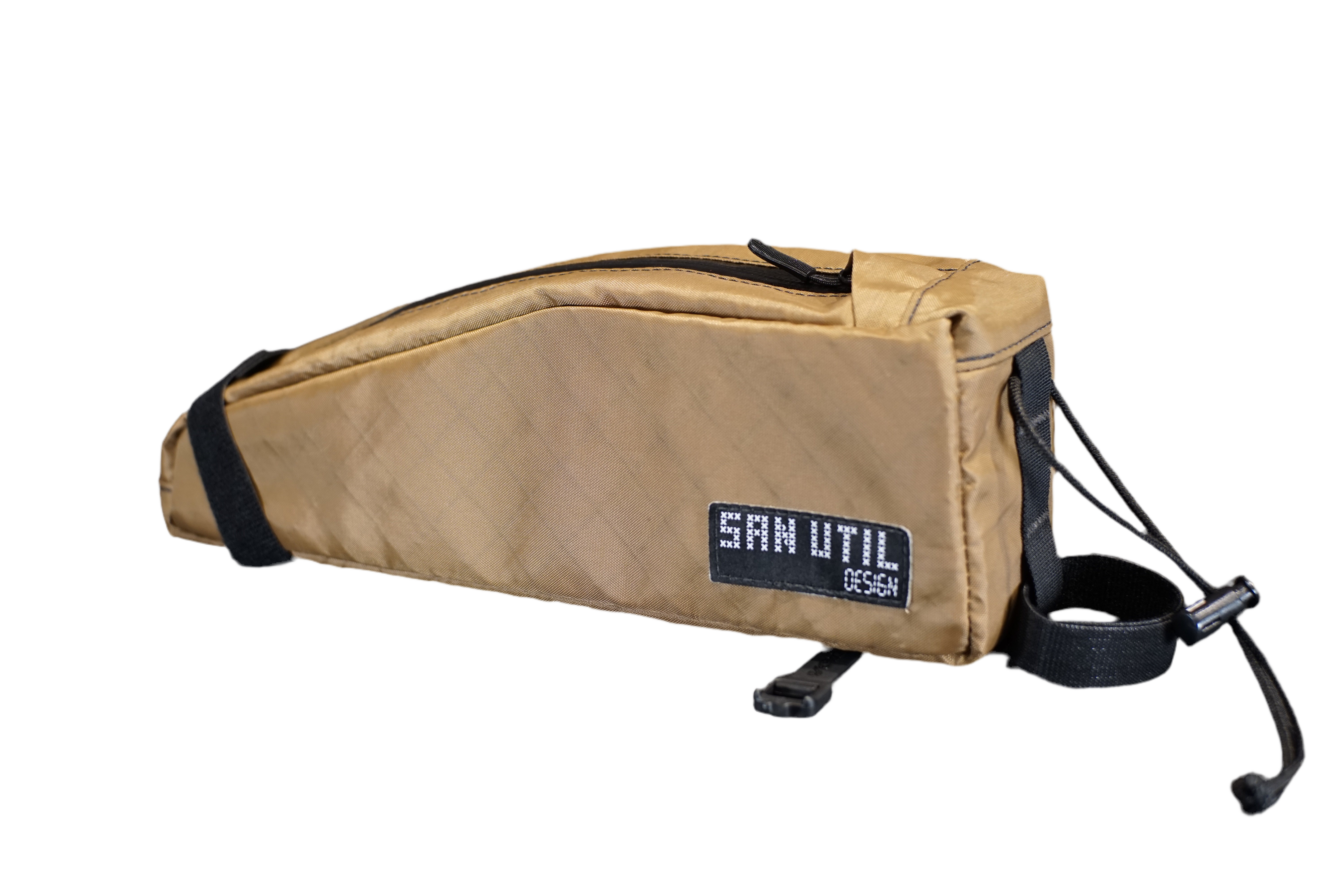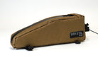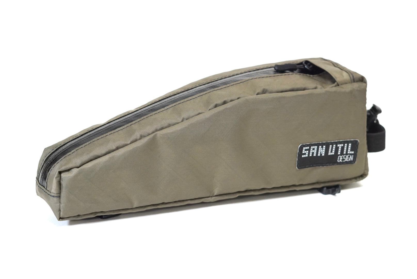 The Fault line is our standard size and shape top tube bag. It is 12" long and 4" tall. The bag tapers from 3" to 2" to allow for plenty of room for knees when you are out of the saddle cranking. The bag has stiffener in it to keep things stable when riding over rough terrain. A 9" Voile Strap is used to keep the front of the bag stable around the frame while a piece of one wrap velcro holds the back the bag down. Use a piece of shock cord to loop over or around the steerer tube and you are looking at a stable TT bag that is easy to open and close with 1 hand and looks real clean.