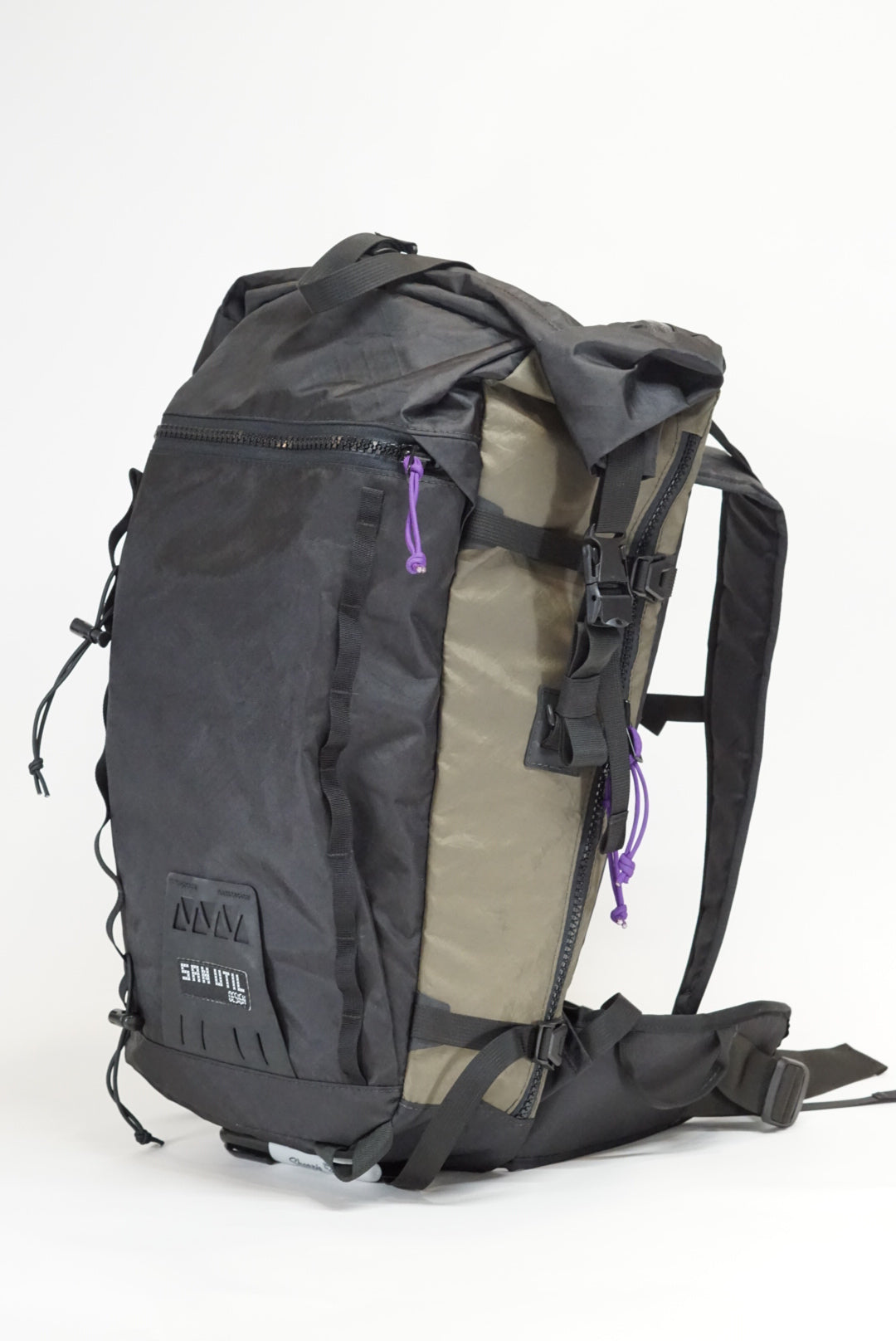 The pack is a roll top design with a zipper pocket on top for a radio or tools. The production version of the pack will have a vertical zipper down the right side panel of the pack to allow access to the pack while it is still rolled. There is a CSM (formerly Hypalon) ice axe/tool cover on the center of the pack where the current San Util tag is.